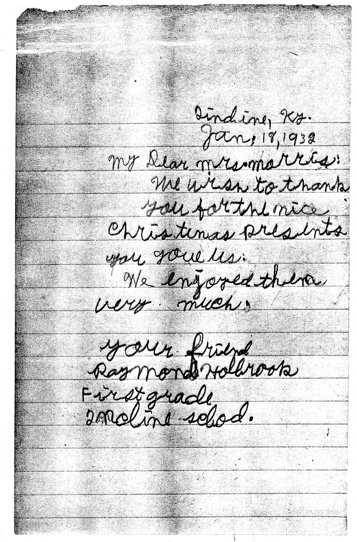 46b. Waldon Holbrook, Third Grade, Incline School, to Mrs. Morris, Jan. 18. 1932, Incline, Ky. “we wish to thank you for the nice Christmas presents you gave us.”