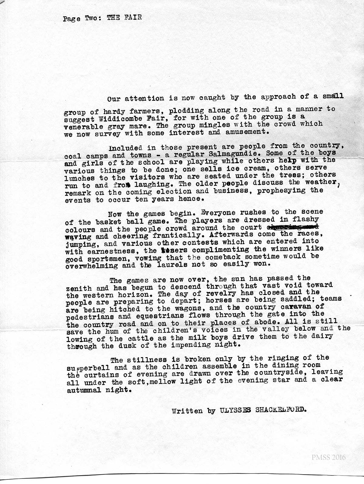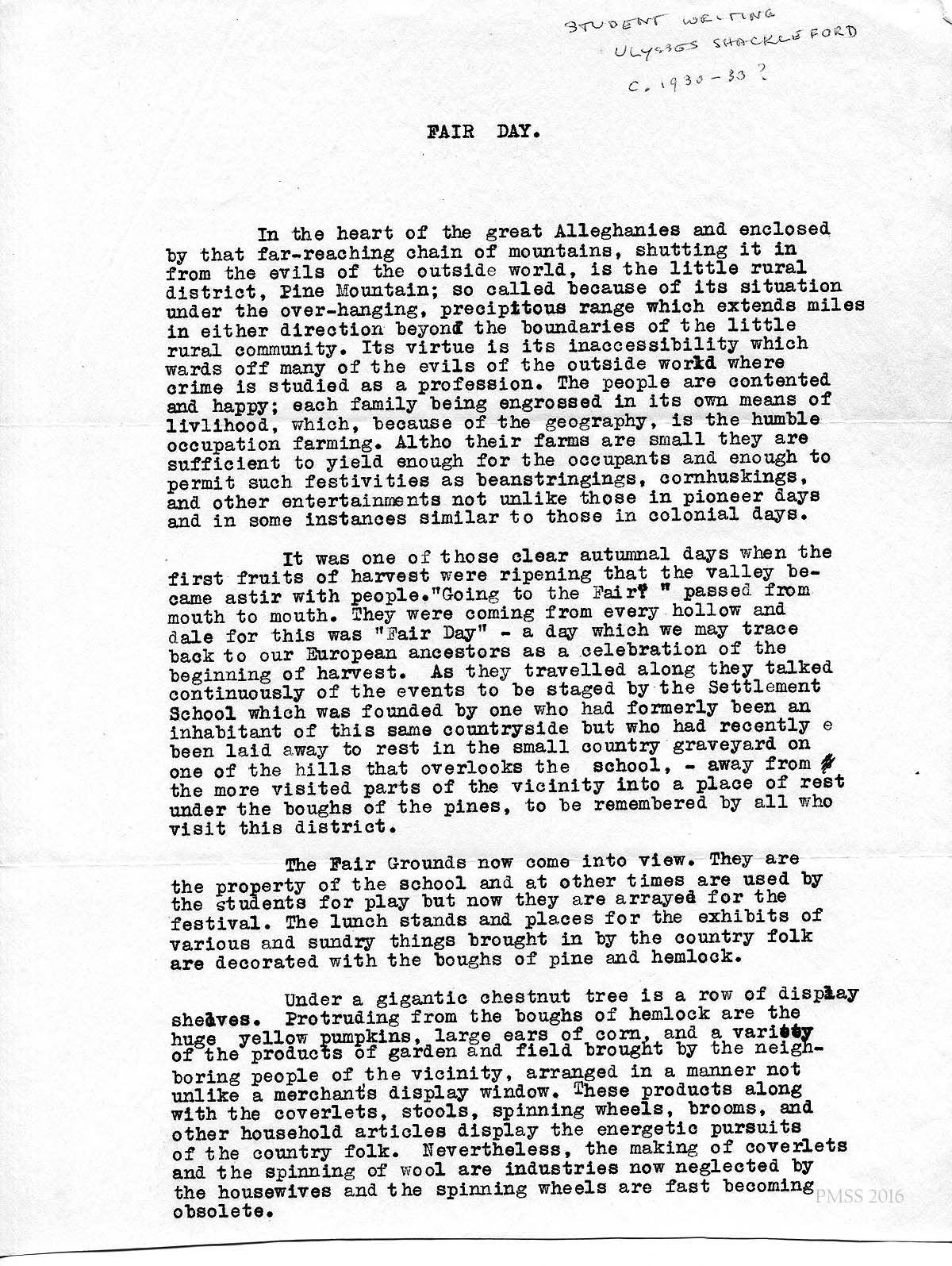 48. [Notation at top of page: “Student writing Ulysses Shackleford, c. 1930 – ?”] [Typewritten] “FAIR DAY. … It was one of those clear autumnal days when the first fruits of harvest were ripening that the valley became astir with people. ‘Going to the Fair?’ — a day which we may trace back to our European ancestors as a celebration of the beginning of harvest….”