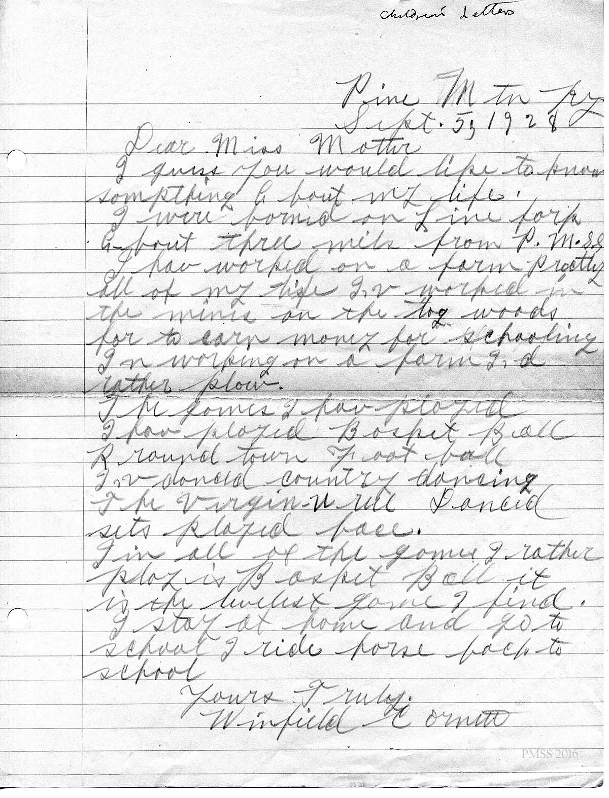 50. Winfield Cornett to Miss Motter, Sept. 5, 1928. “I were borned on Line Fork about three miles from P.M.S.S. I have worked on a farm pretty [much] all of my life. I’ve worked in the mines and the log woods for to [make] money for schooling.”