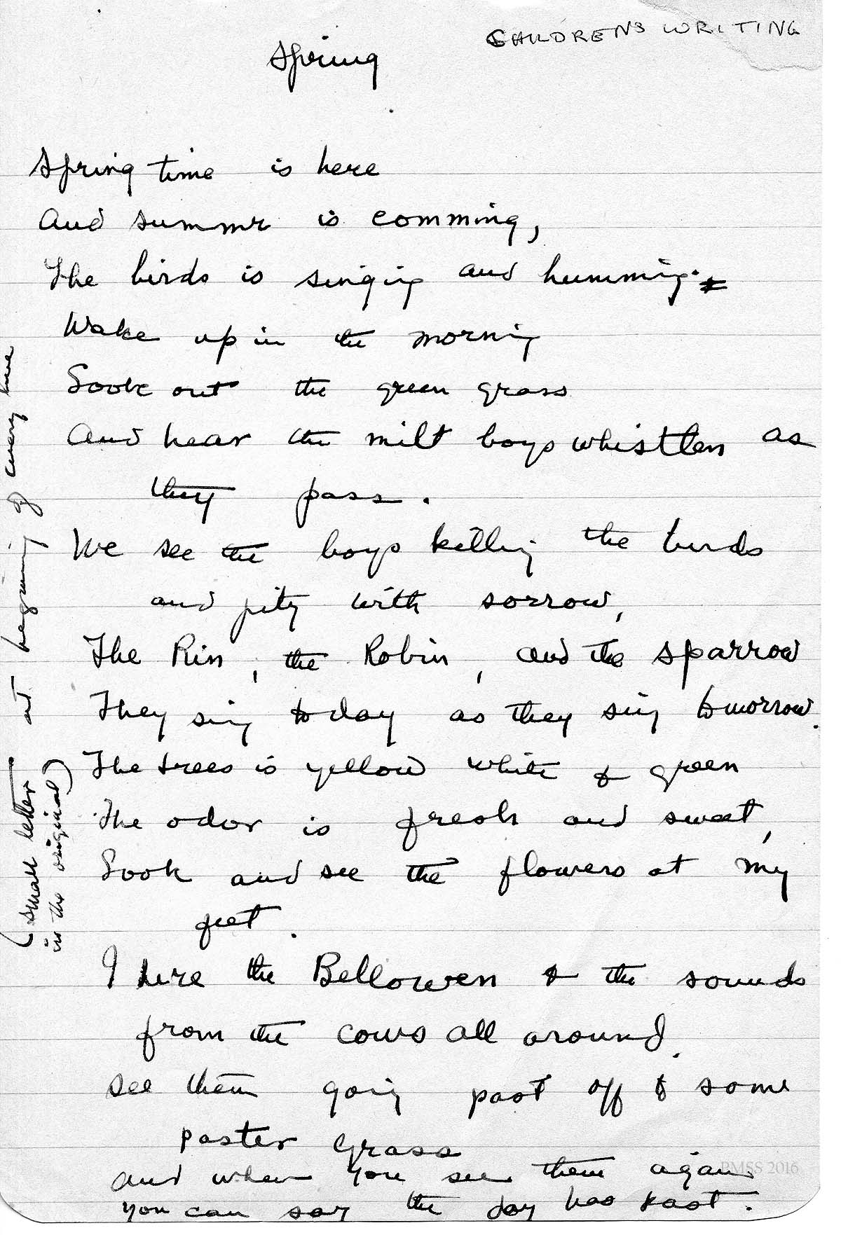 51. [Anonymous poem, n.d.] “Spring. …Wake up in the morning/Look out the green grass/and hear the milk boys whistlin’ as they pass….”