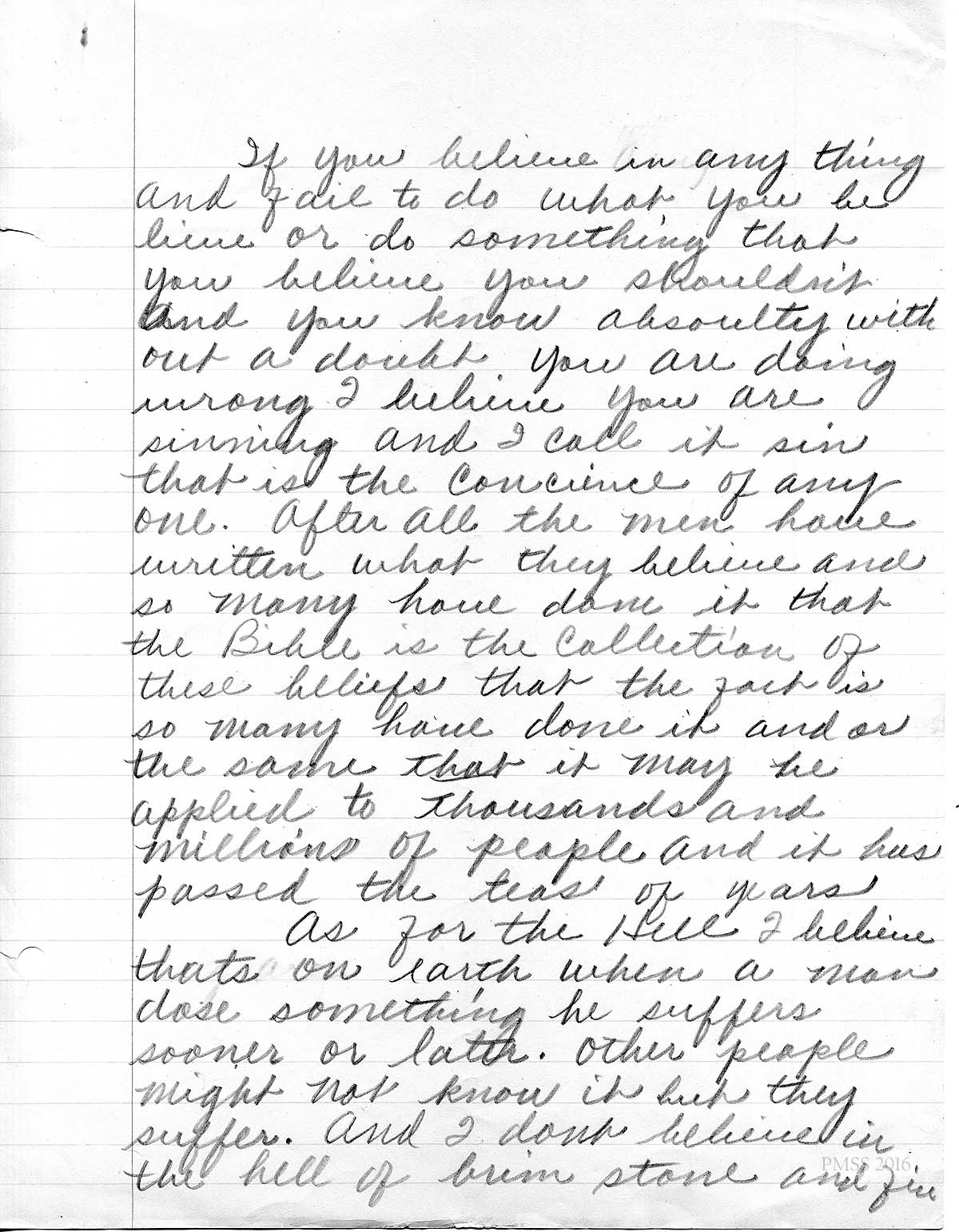 49. James Napier to Miss [Margaret] Motter. [Notation at top of page: “…1930s?”] “English II. “Two years ago I decided to quit school. I was in the first year high school…I decided to go up in Ohio to try to get a job, so the first day I got there I went to work so it made me believe I were a real man and didn’t need any education….[the foreman] put me a hold of a pick and shovel and told me to work hard. When he said that, my mind turned toward how I were going to live so I returned home and begin to school again and I never have had least idea at that kind of work any more.”
