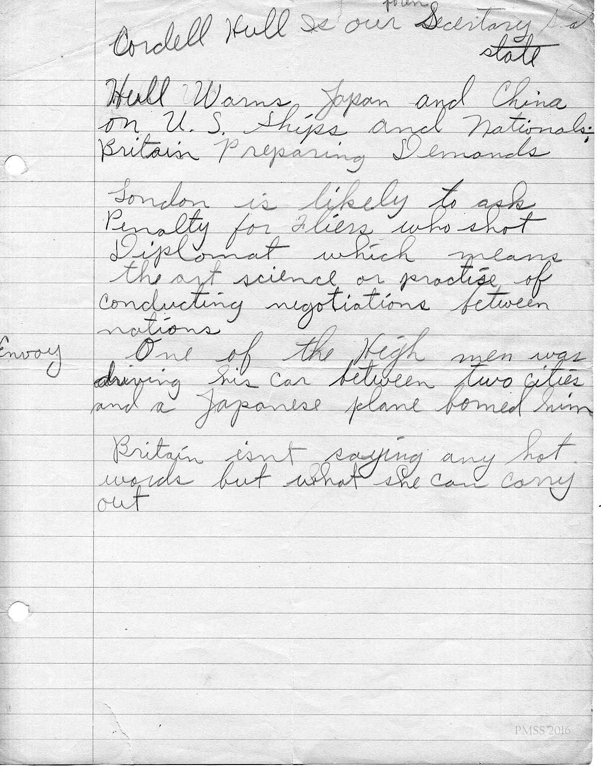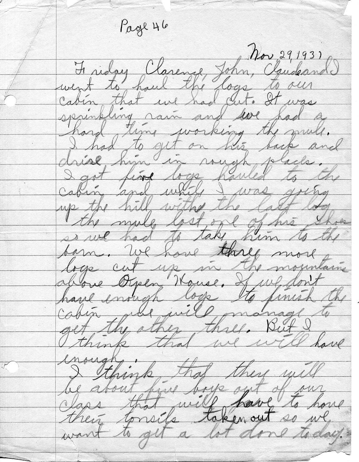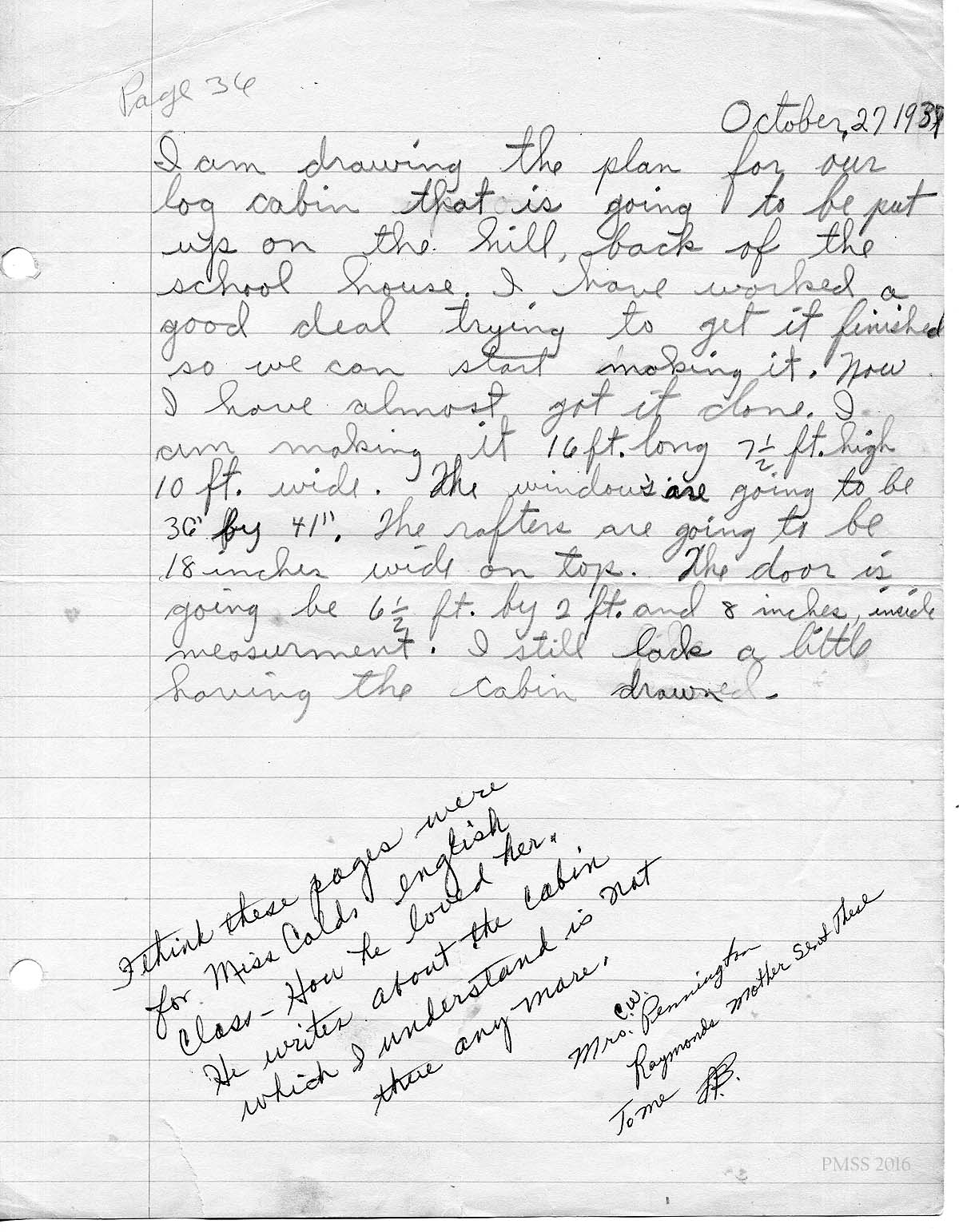 55a – c. [Anonymous], Oct. 27, 1937. [Notation: “I think these pages were for Miss [Edith] Cold’s English class. How he loved her. He writes about the cabin which I understand is not there any more. Mrs. C.W. Pennington. Raymond’s mother sent these to me. L.B.(?)“] “I am drawing the plan for our log cabin that is going to be put up on the hill, back of the school house….” 55b. [Anonymous, continued]. “Cordell Hull is our Secretary of State. Hull Warns Japan and China on U.S. Ships and Nationals; Britain Preparing Demands.” 55c. [Anonymous, continued]. Nov. 29, 1937. “Friday, Clarence, John, Claude, and I went to haul the logs to our cabin that we had cut. It was sprinkling rain and we had a hard time working the mule….I think that there will be about five boys out of our class that will have to have their tonsils taken out so we want to get a lot done today.”