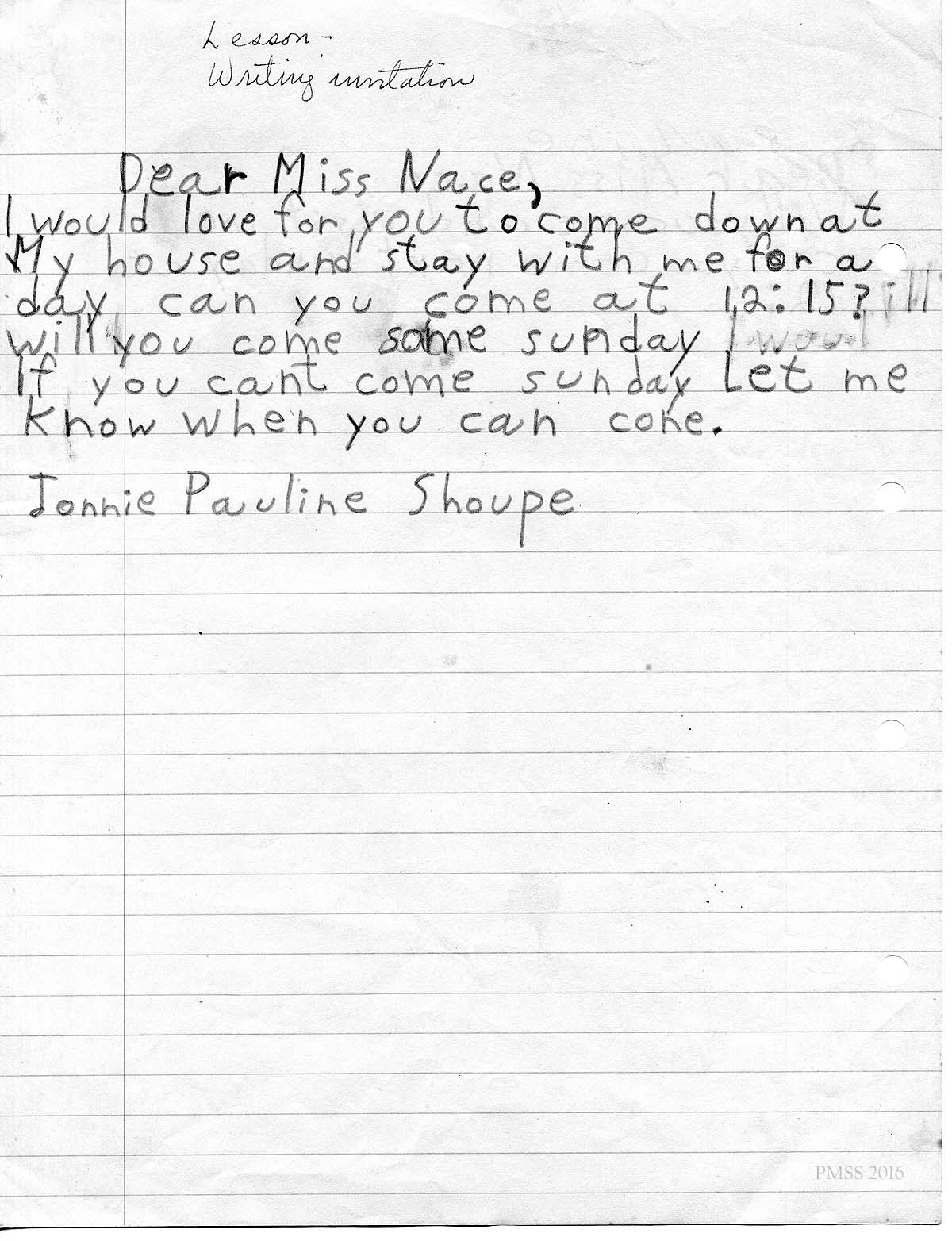 56b. Jonnie Pauline Shoupe to Miss [Dorothy] Nace, [n.d.]. [Notation at top of page: “Lesson – writing invitation”] “I would love for you to come down at my house and stay with me for a day….”