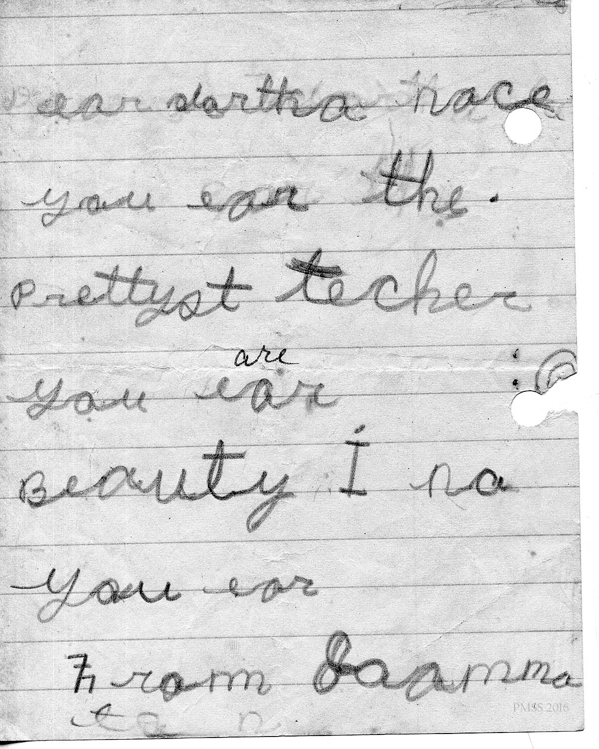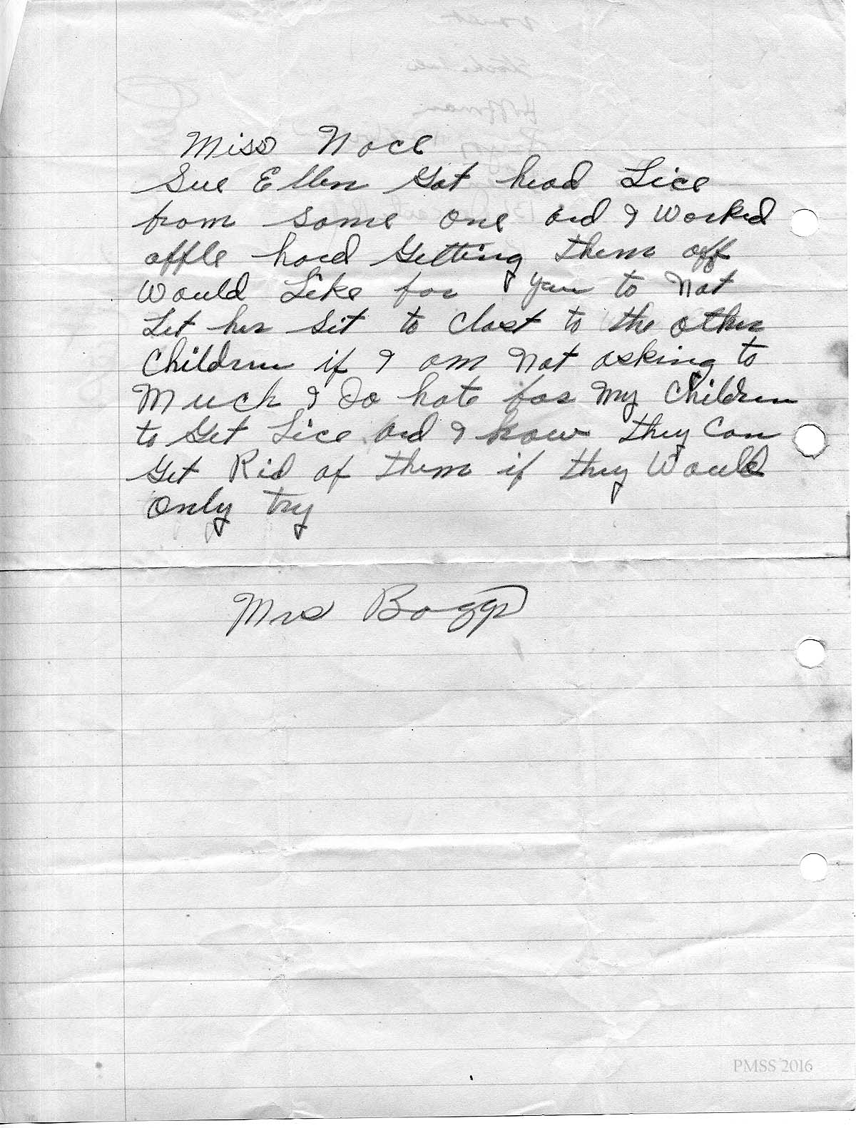 56n. Mrs. Boggs to Miss Nace, [n.d.]. “Sue Ellen got head lice from some one and I worked affel hard getting them off. Would like for you to not let her sit to clost to the other children if I am not asking to much….”