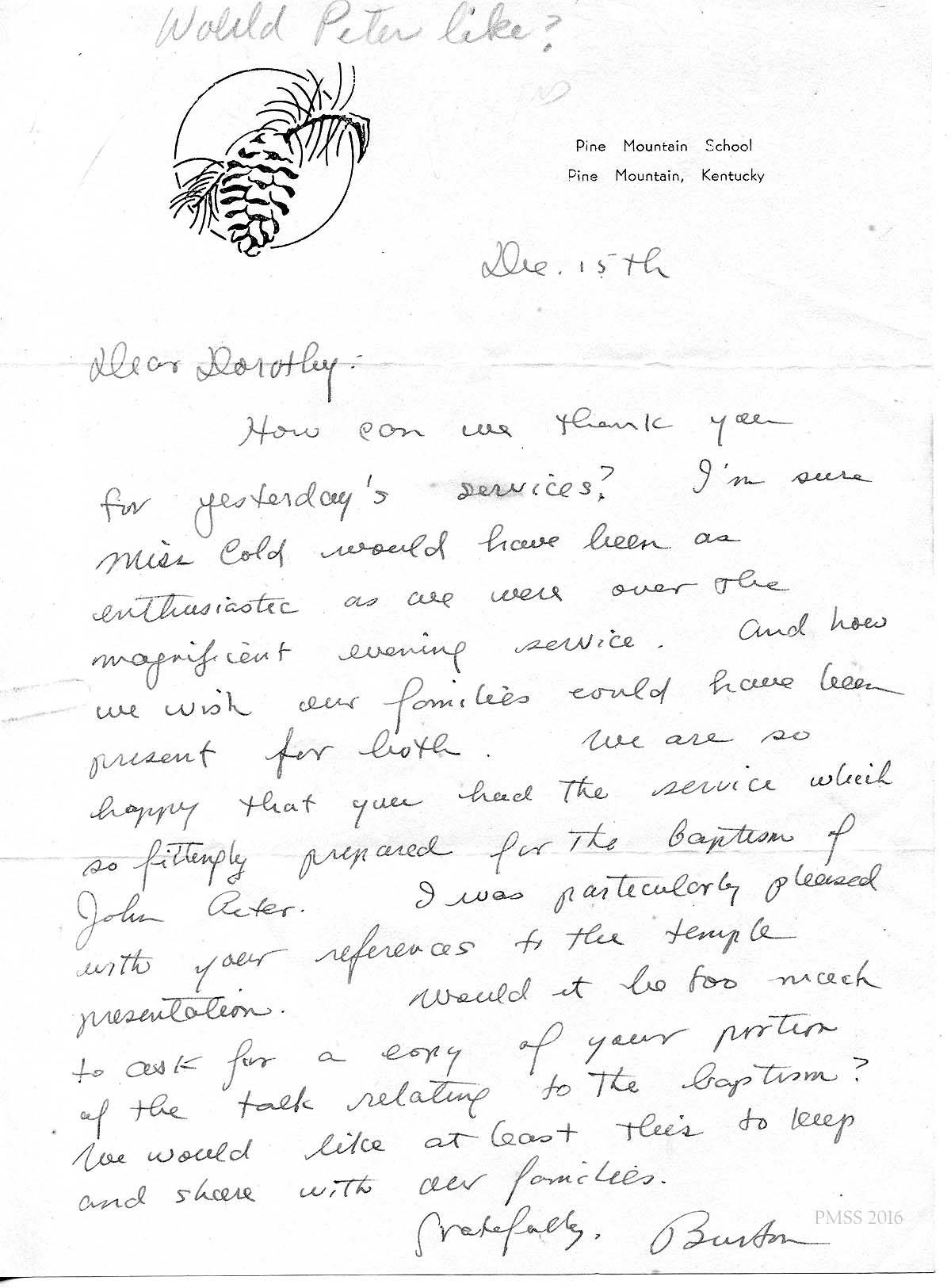 57. Burton [Rogers] to Dorothy [Nace], Dec. 15, [no year]. [Notation at top of page: “Would Peter like?”] “…We are so happy that you had the service which so fittingly prepared for the baptism of John Peter…. “