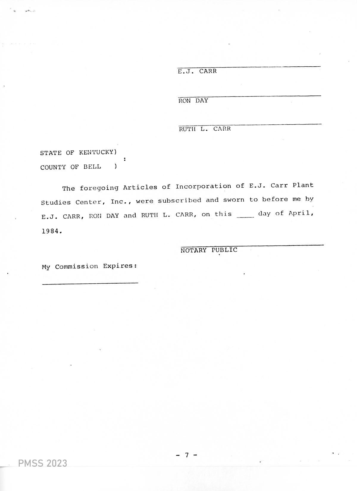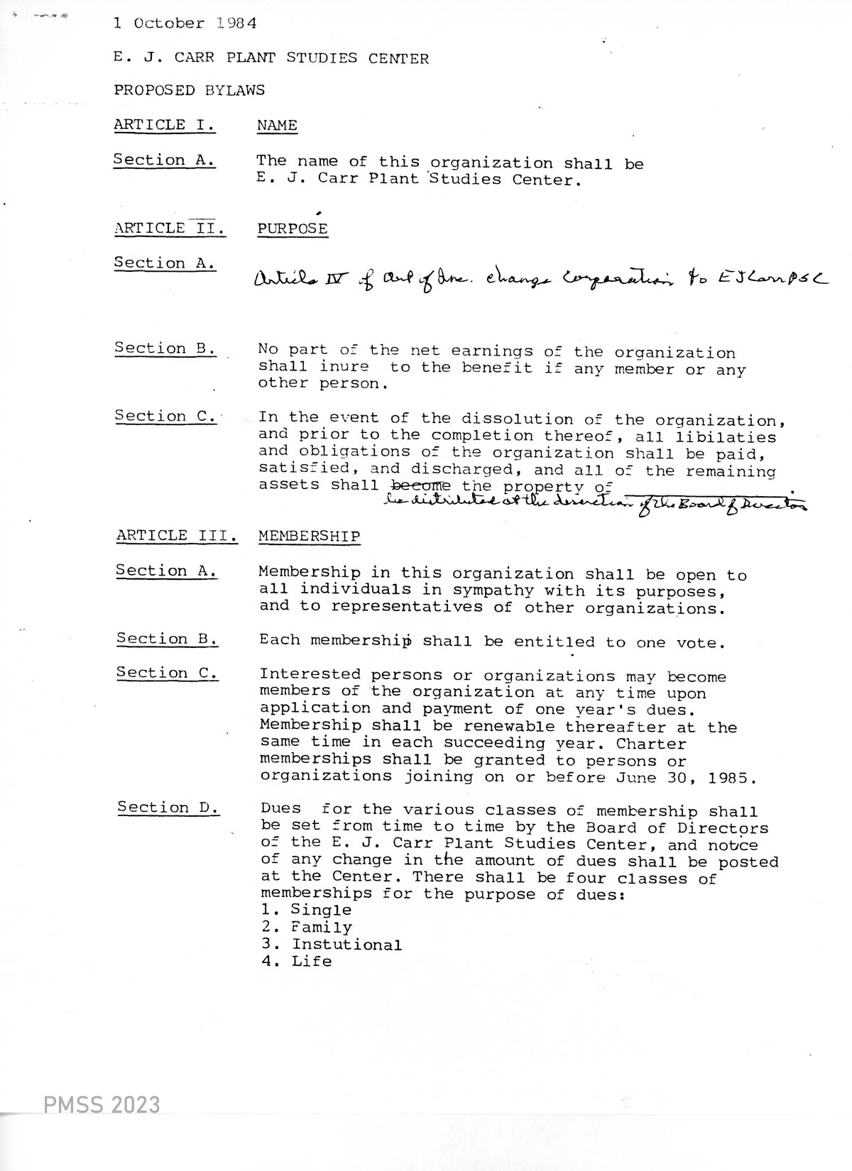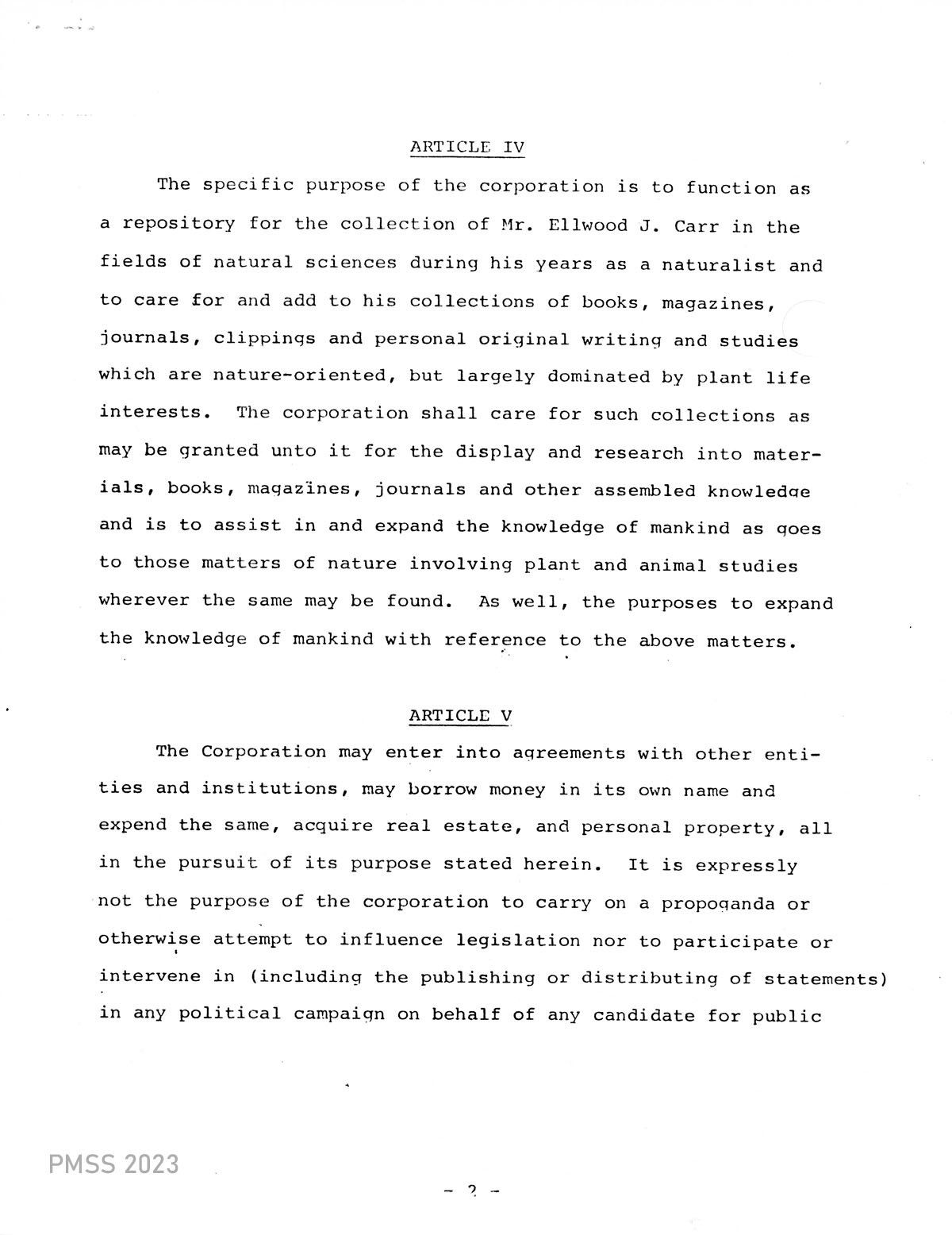 TAGS: Ellwood J. Carr, Plant Studies Center, E. J. Carr Plant Center, botanical studies, herbal collections, botanical collections, letters of incorporation