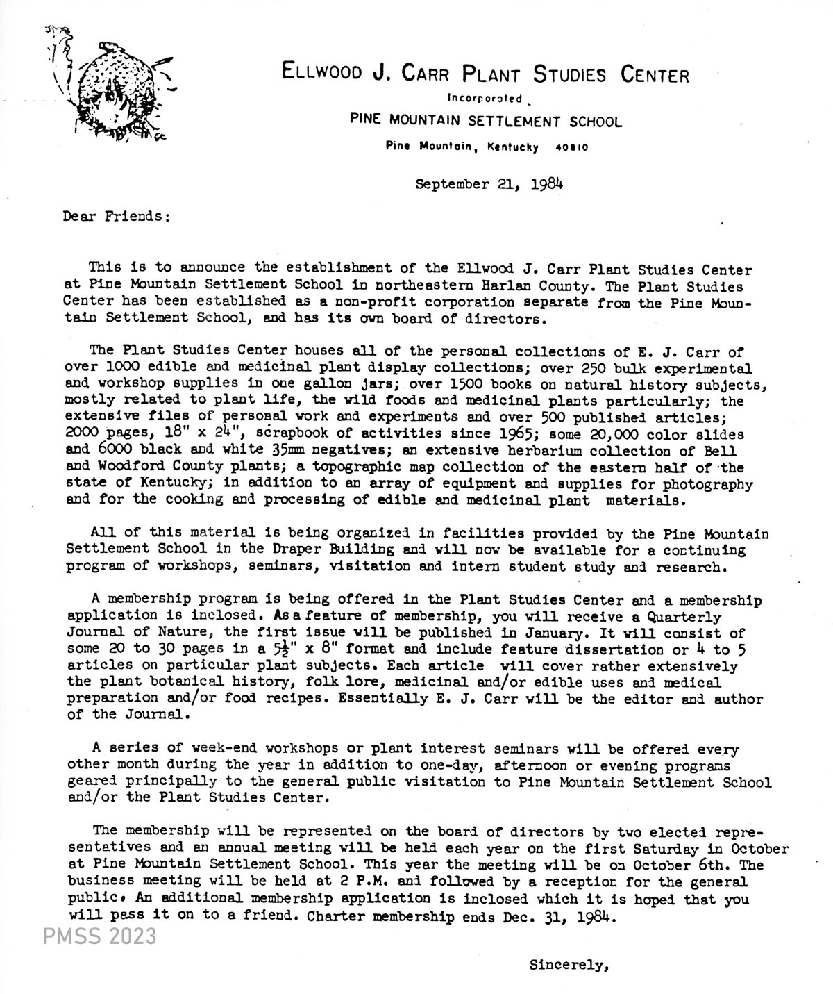 “Dear Friends” Letter Announcing E. J. Carr Plant Center, 1984. [carr_e_j_plant_studies_cntr_estab_001.jpg]