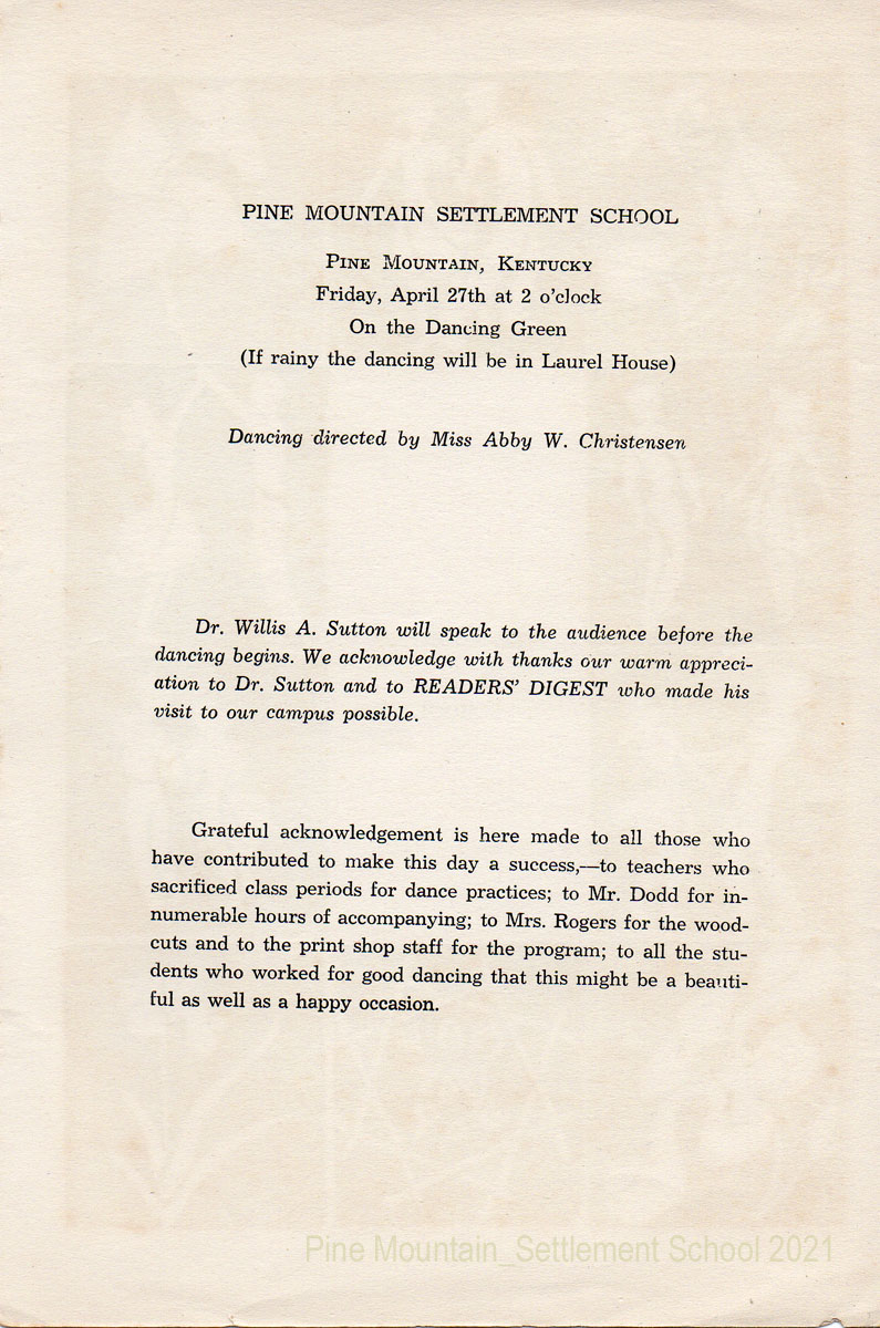 Grateful acknowledgement is here made to all the who have contributed to make this day a success, — to teachers who sacrificed class periods for dance practices; to Mr. [Arthur W.] Dodd for innumerable hours of accompanying; to Mrs. [Mary] Rogers for the wood-cuts and to the print shop staff for the program; to all the students who worked for good dancing that this might be a beautiful as well as a happy occasion.