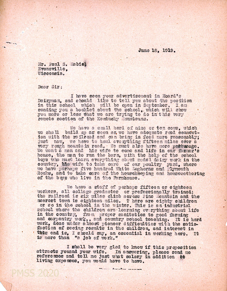 [002] June 18, 1919. To Mr. Paul S. Mabie, Evansville, Wisconsin, from [truncated, likely Katherine Pettit]. In response to an ad in Hoard’s Dairyman, in which he is looking for work, she encloses a booklet and describes “what we are trying to do in this very remote section of the Kentucky Mountains.” Tells about the need to hire a married couple to live in the farmer’s house: A man to run the barn (with 9-10 cows), teach the school boys about “model dairy work” and the wife to care for the poultry yard (containing about 500 White Leghorns and Plymouth Rocks), and serve as housekeeper/housemother the boys in Farmhouse. She describes the school staff (15-18 workers, all college graduates or professionally trained), the railroad, nearest town, and the approximately 80 students. “This is an industrial school where the children are learning everything about life in the country, from proper sanitation to good farming and carpentry work, and country school teaching. It is hard work, done under almost pioneer difficulties with the satisfaction of seeing results in the children….”