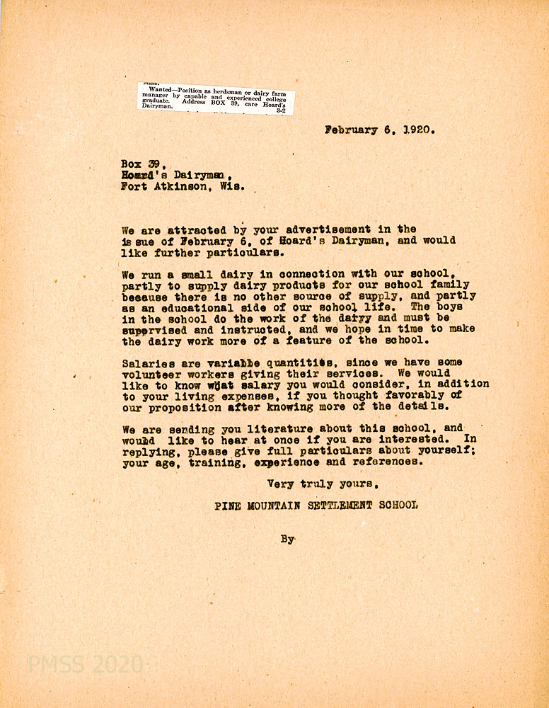 The following contents list and images of FARM AGRICULTURAL CORRESPONDENCE consist of letters between the School’s co-founders and applicants for the Assistant Farm Superintendent position at Pine Mountain Settlement School in 1919 and 1920. The correspondence provides a look at both the hiring practices of the School and the School’s fledgling dairy farm during the first decade of the School’s existence.