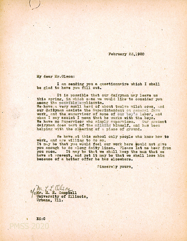 [018], [018a] February 18, 1920. Two-page letter from L.L. Olson, ℅ M.H. Campbell, University of Illinois, Urbana, IL. Showing interest in PMSS’s offer of a “herdsman” position, he provides details about himself: 30 years old; will be married this year; graduated from College of Agriculture at Missouri University about a year ago. “I have spent about seven months supervising official test of dairy cattle in the state of Illinois.”