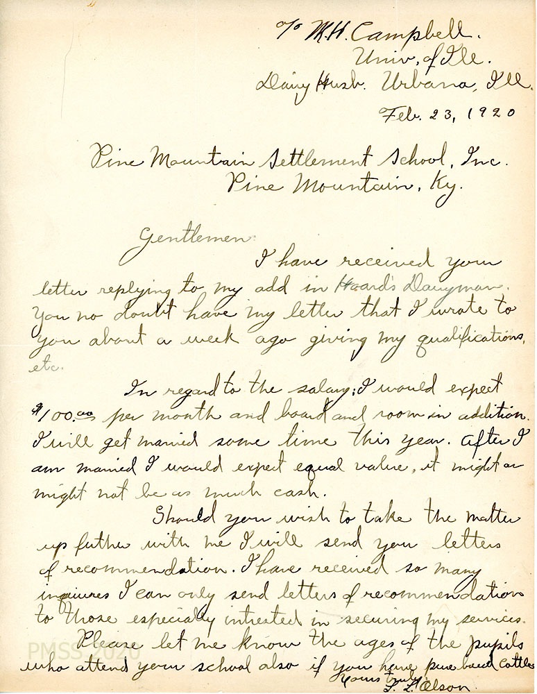[021] February 23, 1920. To “Gentlemen,” PMSS, from L.L. Olson, stating the salary he would expect (“$100 per month and board and room in addition”) and, after his marriage this year, “I would expect equal value, it might or might not be as much cash.” Offers to send letters of recommendation. Asks the students’ ages and if the School has purebred cattle.