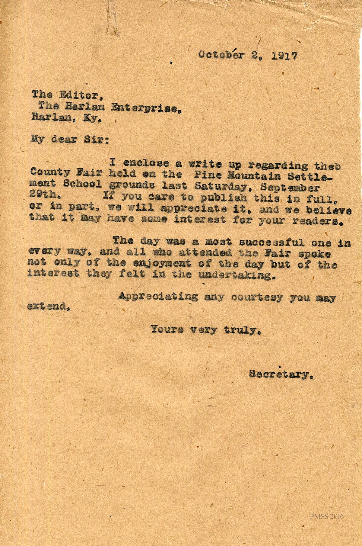 2.  [001] October 2, 1917. Katherine Pettit to the Editor, Harlan Enterprise (newspaper), Harlan, Kentucky. Pettit encloses a write-up of the County Fair held on the School grounds, September 29th and invites publication. She relates that “The day was a most successful one in every way, and all who attended the Fair spoke not only of the enjoyment of the day but of the interest they felt in the undertaking,”