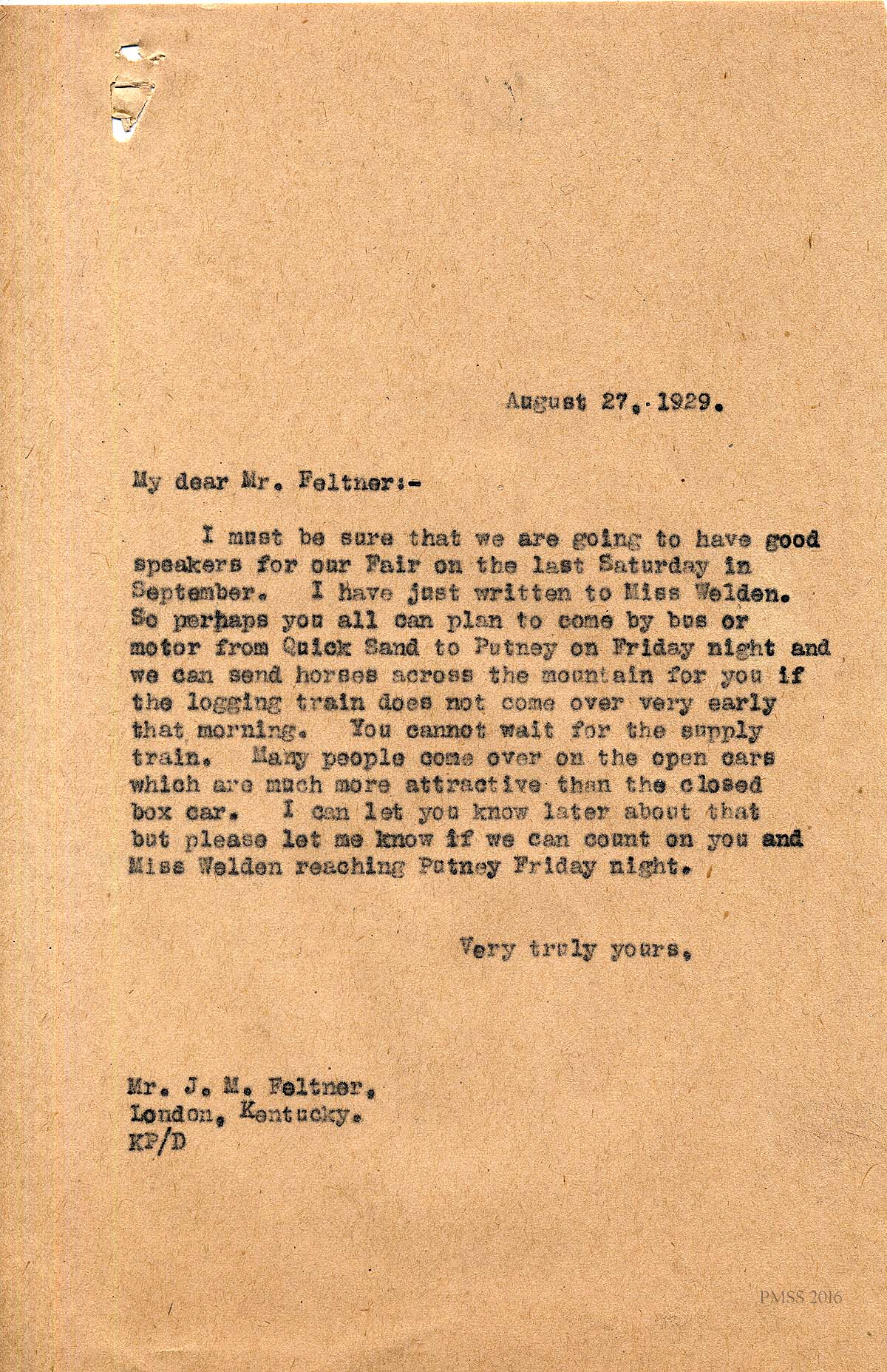[008] August 27, 1929. Letter from Katherine Pettit to Mr. J.M. Feltner. of the Quicksand Agricultural Station of the University of Kentucky. Pettit advises Feltner of the best method of travel to the School and suggests that he pair with Miss Weldon to come to the School. She advises that if he comes by train over the mountain, that the open cars…”are much more attractive that the closed box car.” Pettit wants to know if the two of them can arrive by Friday night.