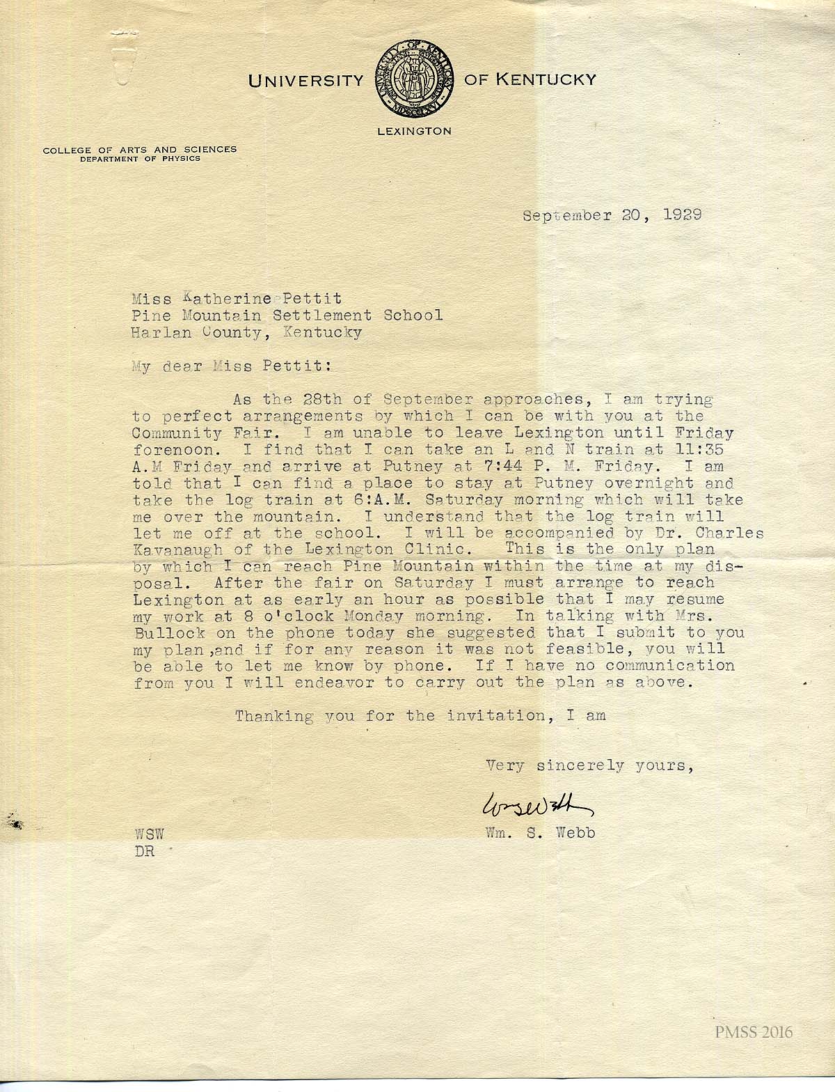 [005] August 15, 1929. Letter from William S. Webb, Professor in the College of Arts and Sciences, Department of Physics, University of Kentucky, to Katherine Pettit. Webb replies to Pettit that he will be able to speak at Fair Day but fears events may change on his end. He advises Pettit that his wife Aleen will accompany him to the School if by car but will not come if he comes by train.