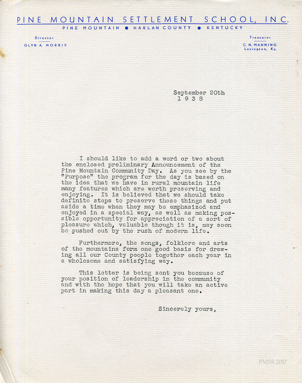 Glyn A. Morris, then-Director of PMSS, explains the purpose of the 1938 Fair Day in a letter dated September 20, 1938, to community leaders [See image 001, Gallery II below]:
