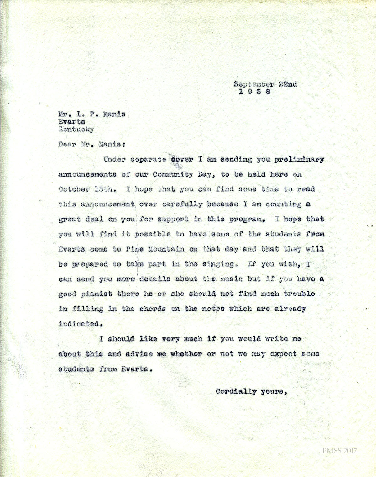 [002] September 22, 1938. To Mr. L.F. Manis, Evarts, KY, from [unsigned]. Similar to 003 letter, asking him to send Evarts students to sing at the Fair.