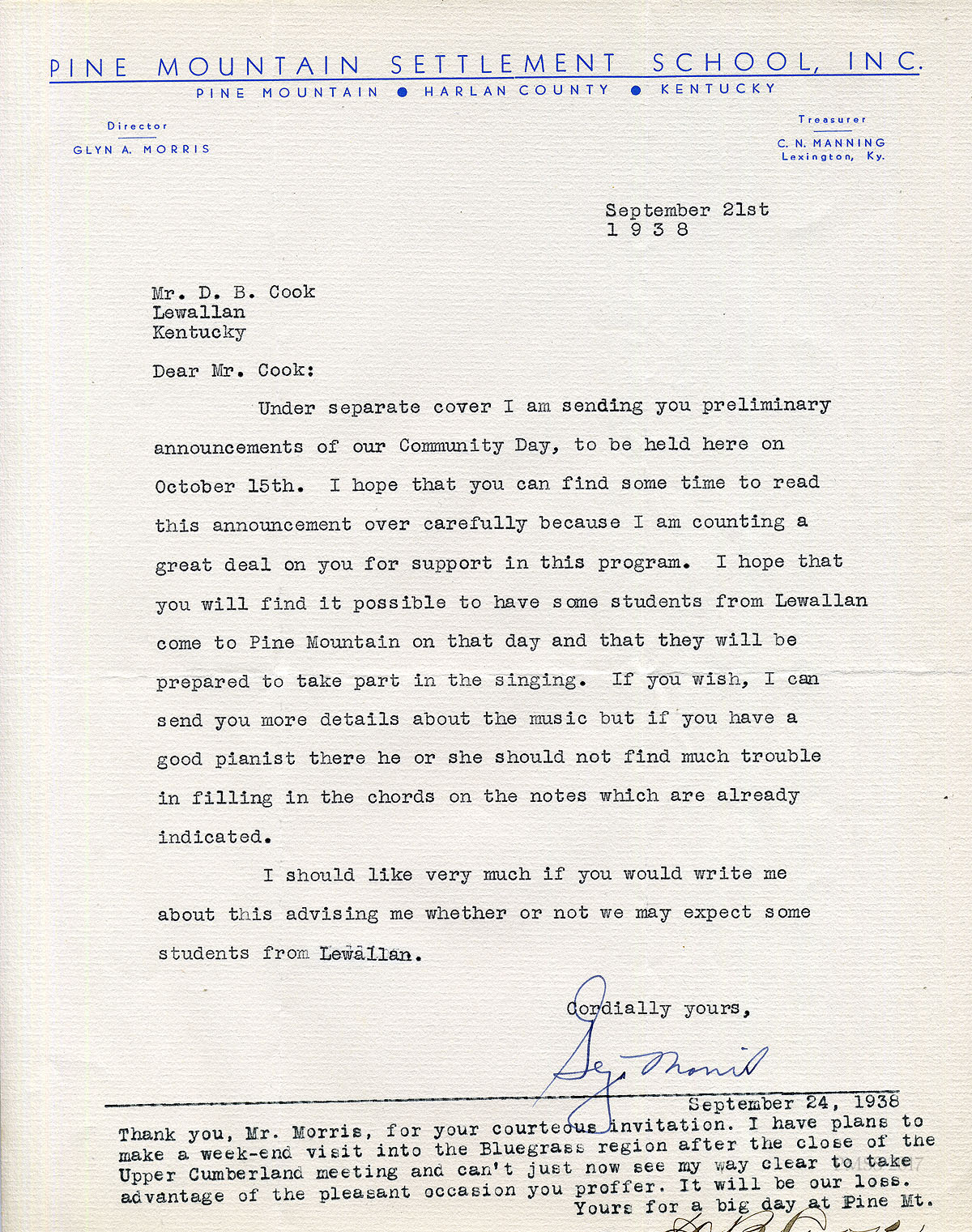 [003] September 21, 1938. To Mr. D.B. Cook, Lewallan, KY, from Glyn Morris, who is sending preliminary announcements of the Community Day for his review. He invites Cumberland students to “take part in the singing.” [This is an original signed letter with the addition of a typed response from Cook, who explains why he must decline the invitation.]