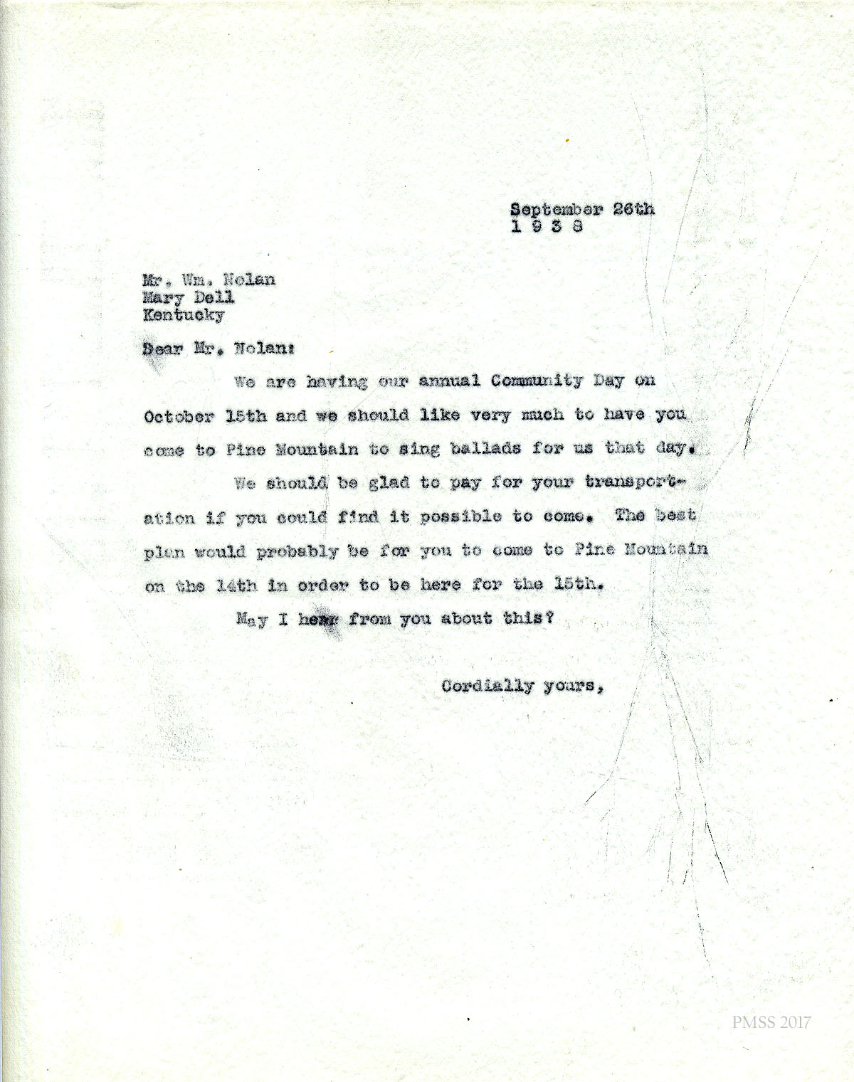 [004] September 26, 1938. To Wm. Nolan, Mary Dell, KY, from [unsigned] inviting him to sing ballads at the PMSS Fair Day; PMSS will pay for his transportation.