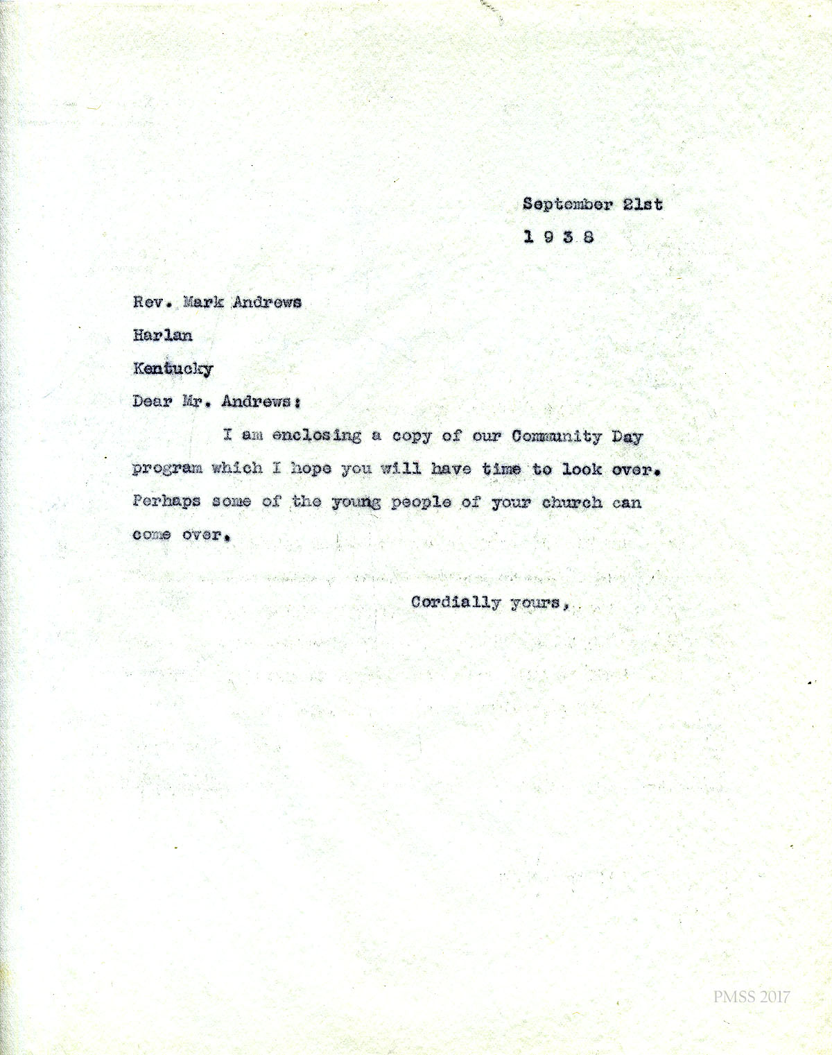 [005] September 26, 1938. To Rev. Mark Andrews, apparently Morris], who is sending preliminary announcements of the Community Day for his review.