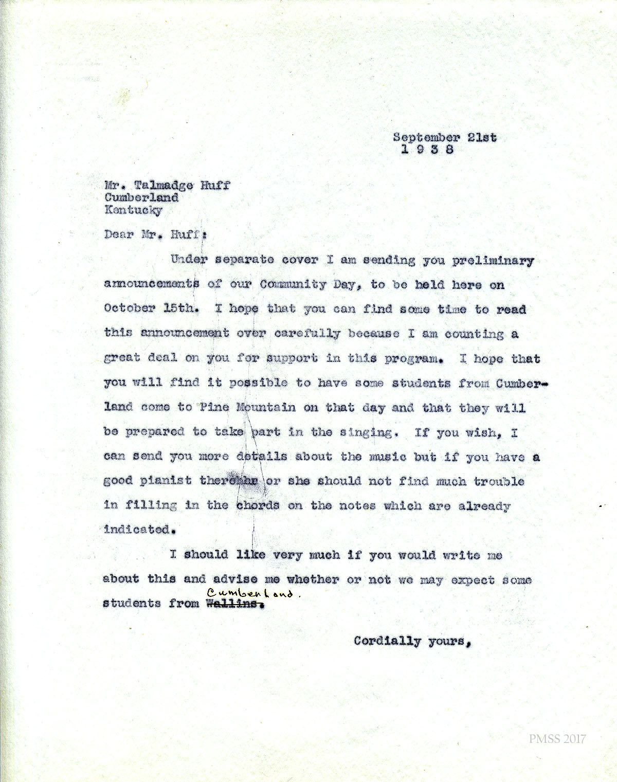 [010] September 22, 1938. To Kyle Whitehead, Harlan Daily Enterprise, from [unsigned], enclosing information about Pine Mountain Community Day. “Will you give it a good write-up?”