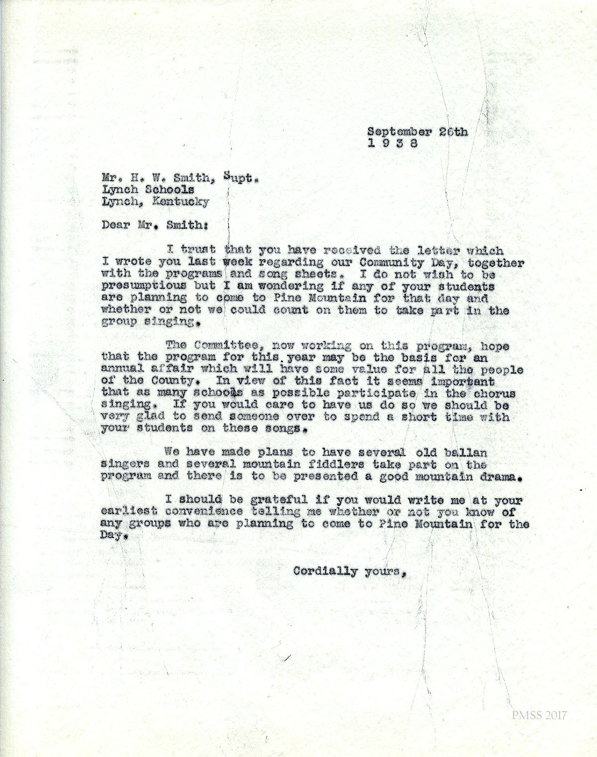 [011] September 26, 1938. Mr. H.W. Smith, Supt., Lynch Schools, Lynch, KY, from [unsigned]. A followup to his September 21 letter, asking if any students will be coming to Fair Day to sing.
