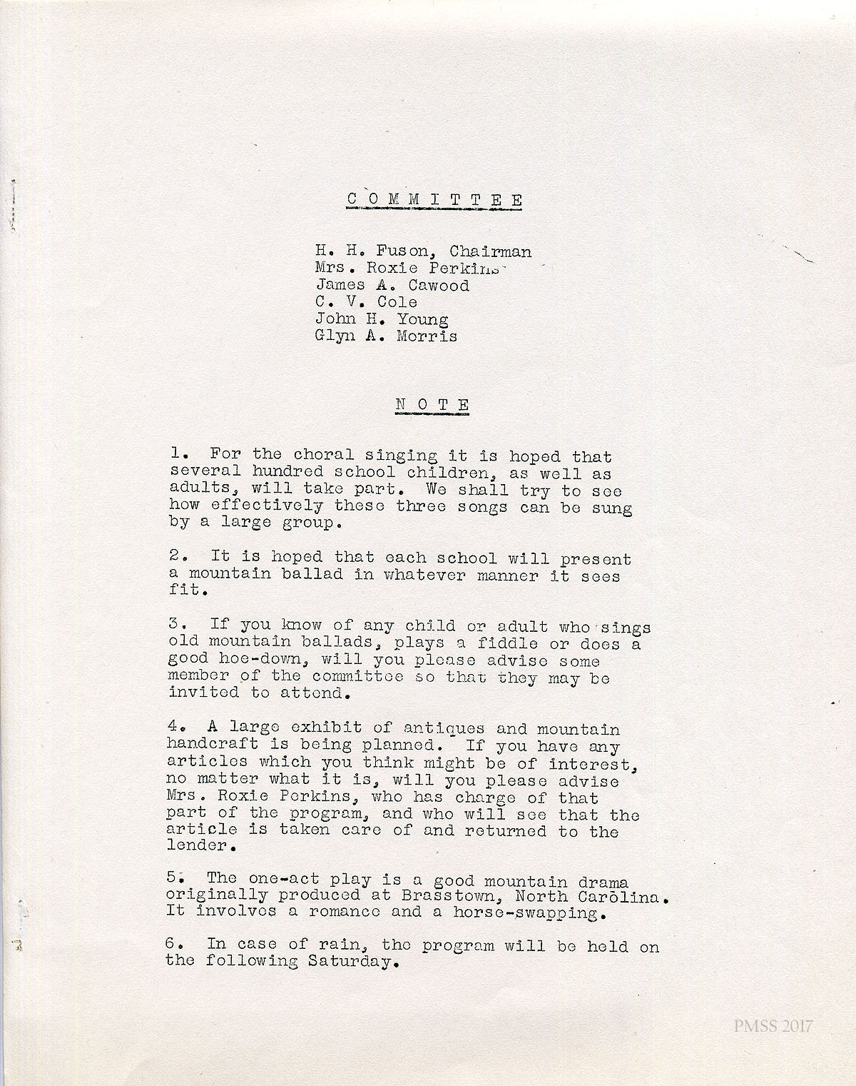 [017] COMMITTEE: H.H. Fuson (Chair), Mrs. Roxie Perkins, James A. Cawood, C.V. Cole. John H. Young, Glyn A. Morris. NOTE: A list of plans for the events, such as choral singing, mountain ballad singing, recruiting singers and instrumentalists, exhibits of antiques and handcrafts, rain date, and the one-act play (“a good mountain drama originally produced at Brasstown, North Carolina. It involves a romance and a horse-swapping.”)