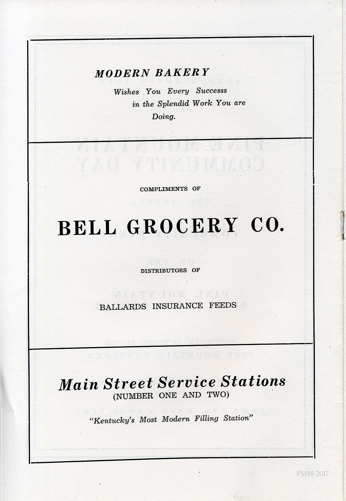 [019] Advertisements: Modern Bakery, Bell Grocery Co. (“Ballards, Insurance, Feeds”), and Main Street Service Stations.