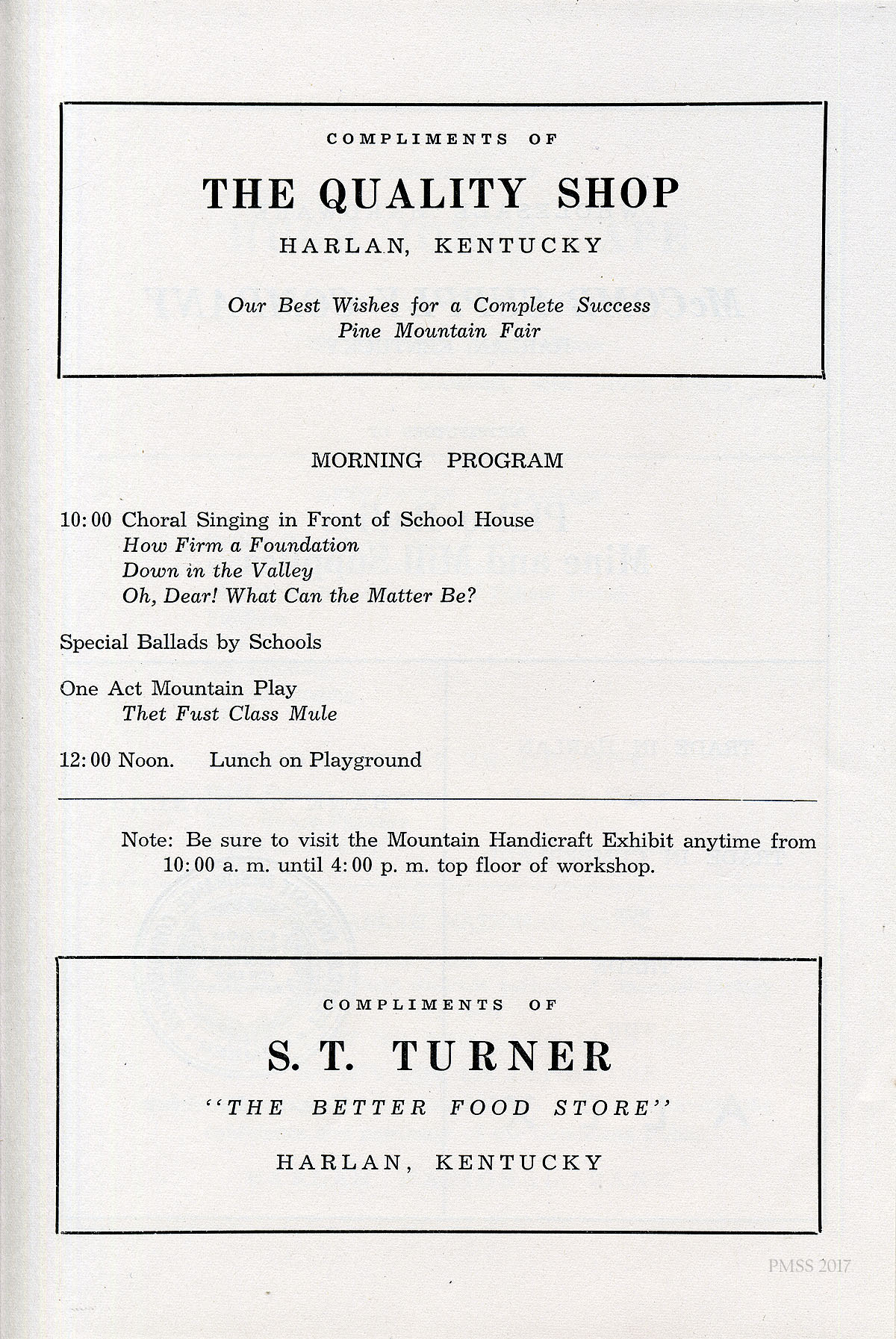 [020] MORNING PROGRAM: Choral Singing in Front of School House, Special Ballads by Schools, One Act Mountain Play (“Thet Fust Class Mule”), Lunch. Advertisements: The Quality Shop (Harlan) and S.T. Turner (food store, Harlan).