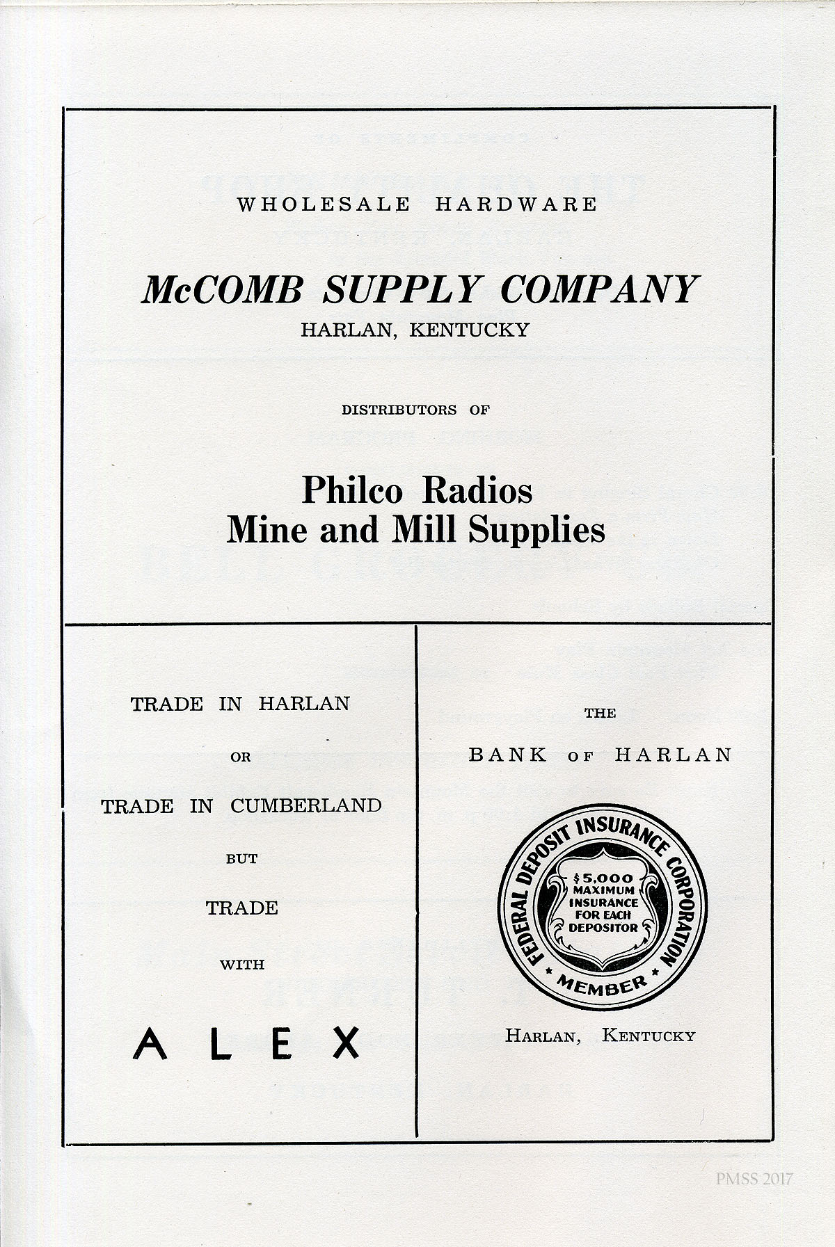 [021] Advertisements: McComb Supply Company (Harlan, “Philco, Radios, Mine and Mill Supplies”), “Trade in Harlan or Trade in Cumberland but trade with ALEX,” and The Bank of Harlan.