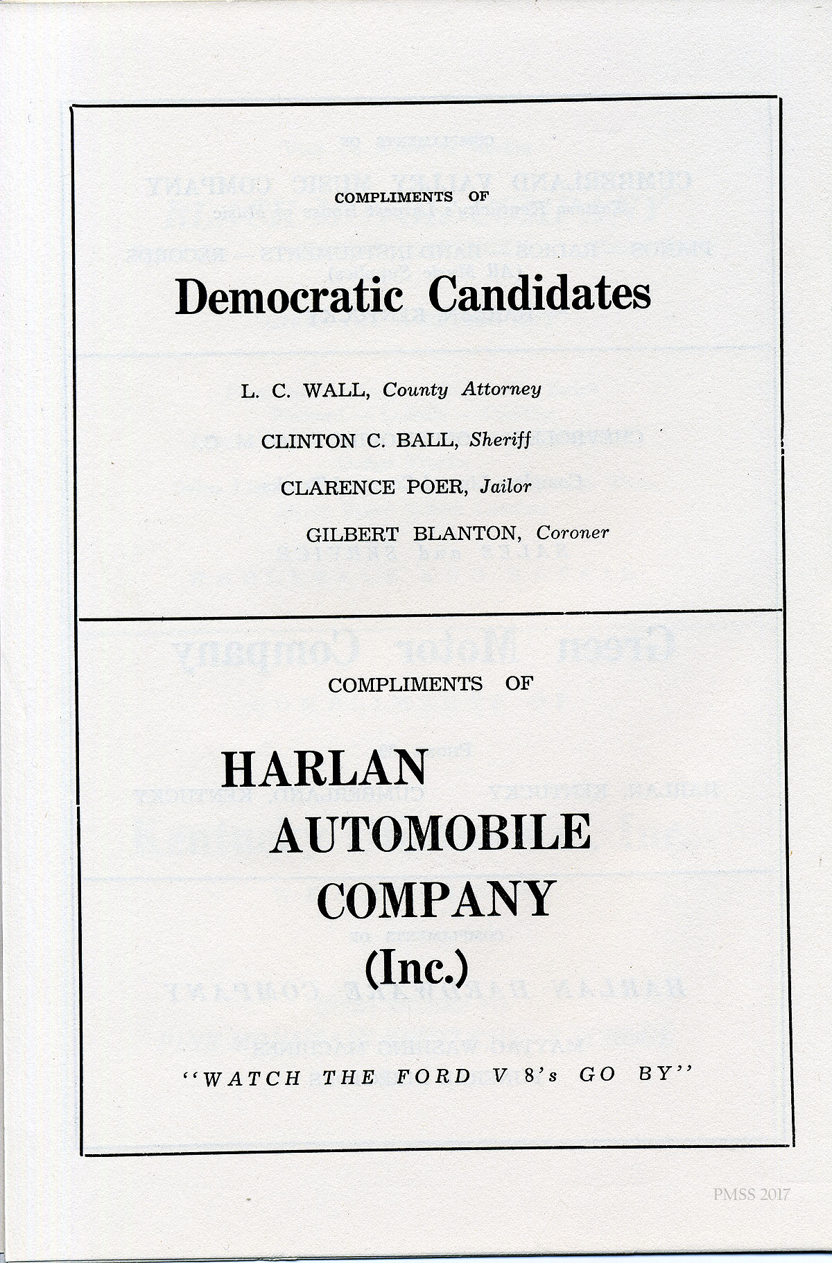 [025] Advertisements: Democratic Candidates (L.C. Wall, Clinton C. Ball, Clarence Poer, Gilbert Blanton) and Harlan Automobile Company.