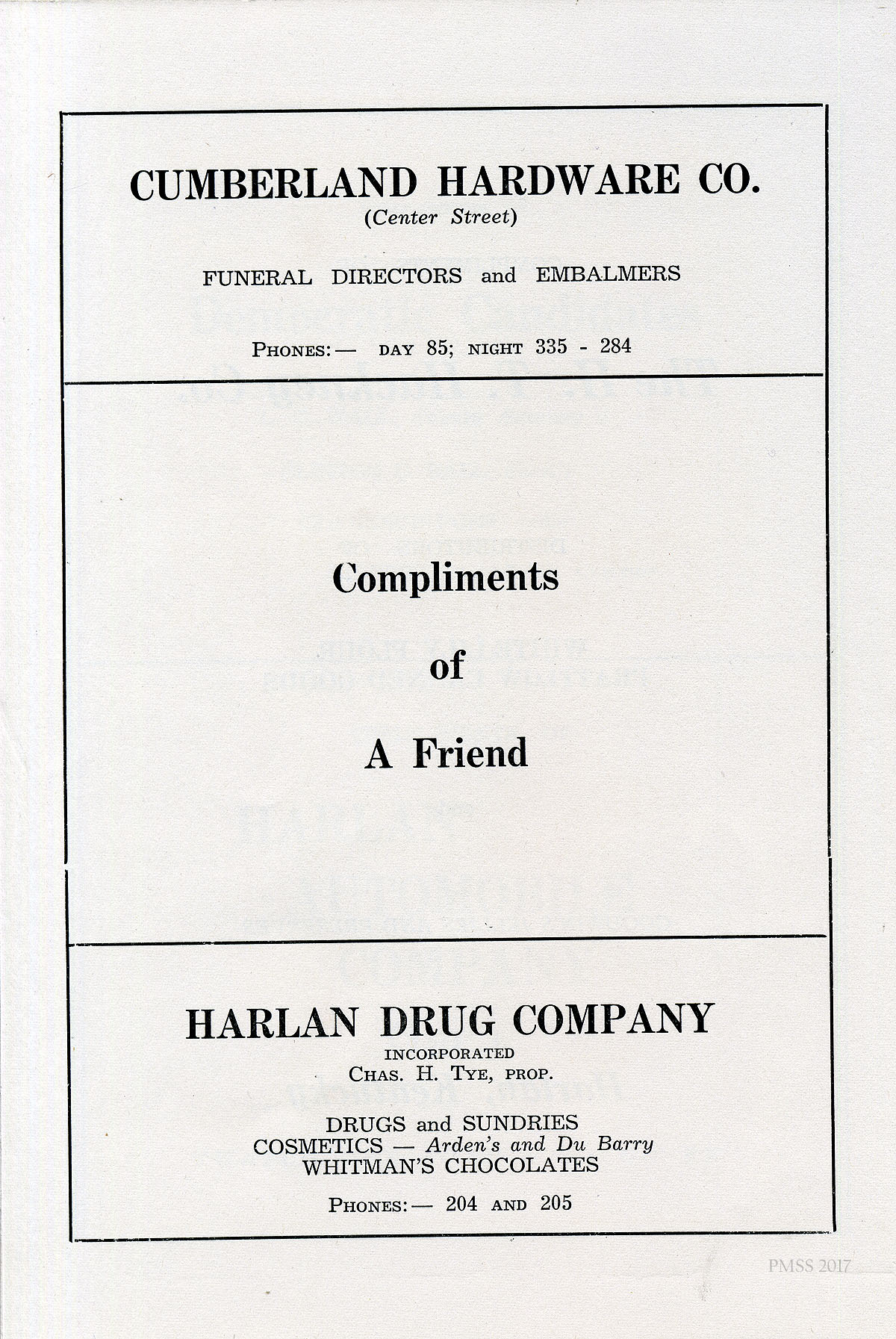 [027] Advertisements: Cumberland Hardware Co. (“Funeral Directors and Embalmers”), “A Friend,” and Harlan Drug Company (Chas. H. Tye, Prop.).