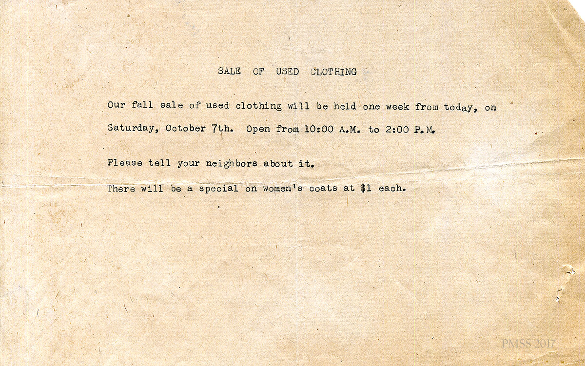 04 N.D. “SALE OF USED CLOTHING,” a memo announcing the date of the fall sale. “There will be a special on women’s coats at $1 each.”