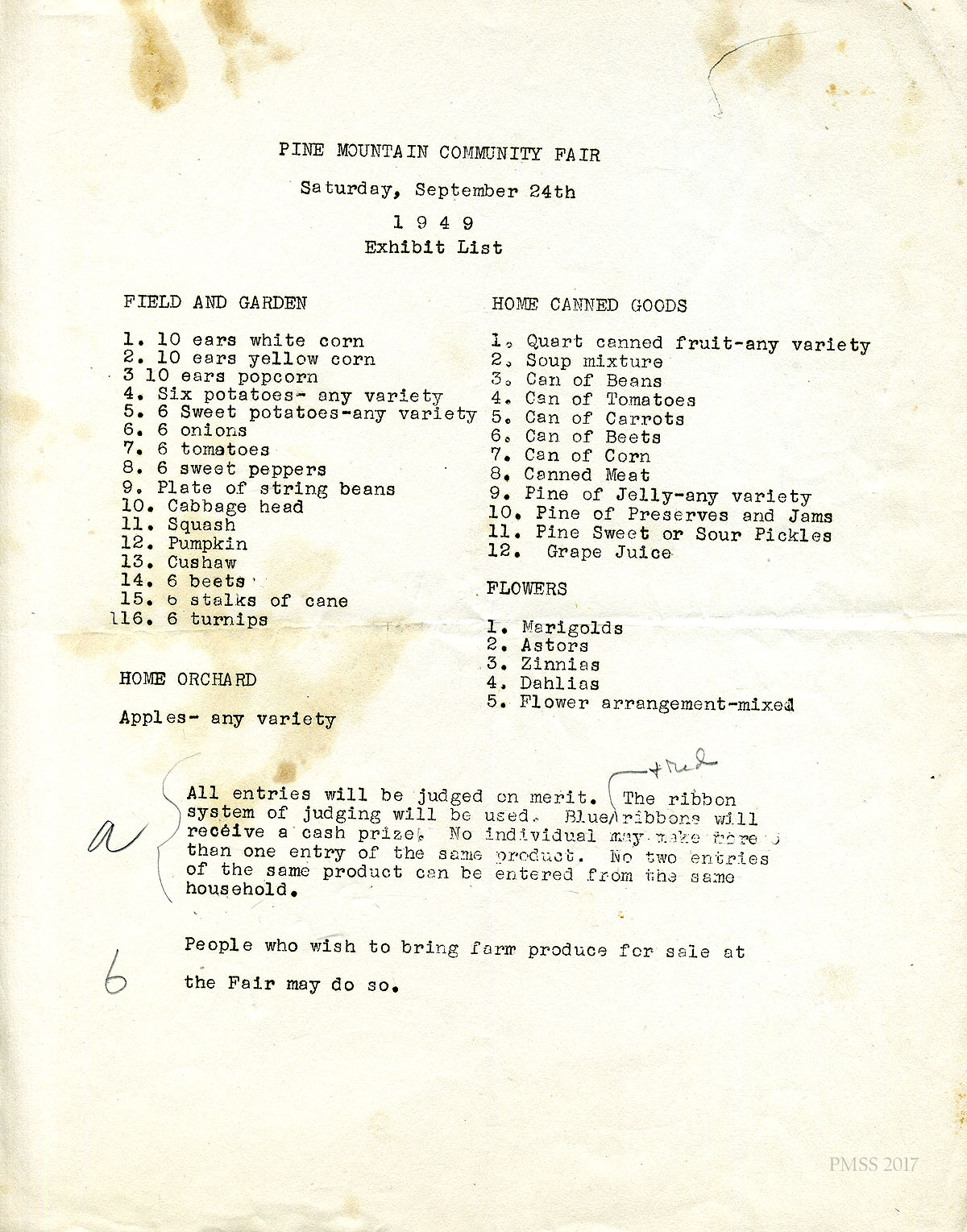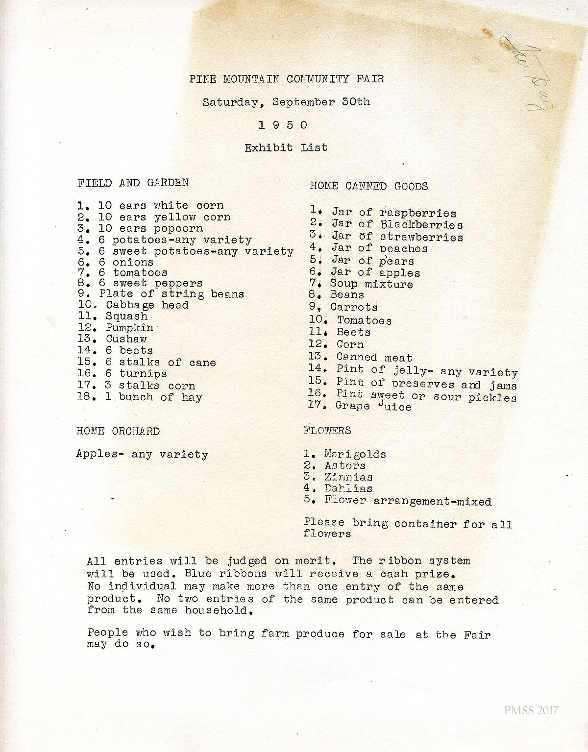 05 N.D. Exhibit List of items by categories, such as Field and Garden, Home Canned Goods, Home Orchard, and Flowers. “All entries will be judged on merit. The ribbon system will be used. Blue ribbons will receive a cash prize…. People who wish to bring farm produce for sale at the Fair may do so.”
