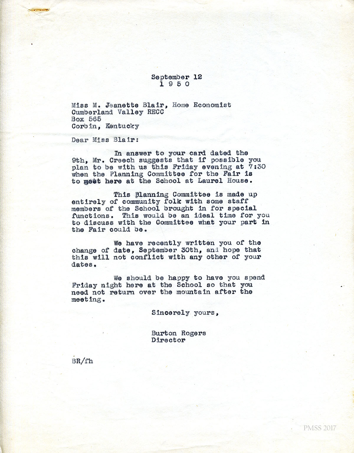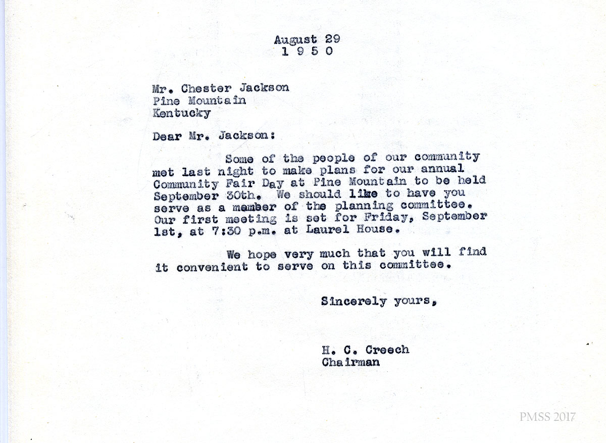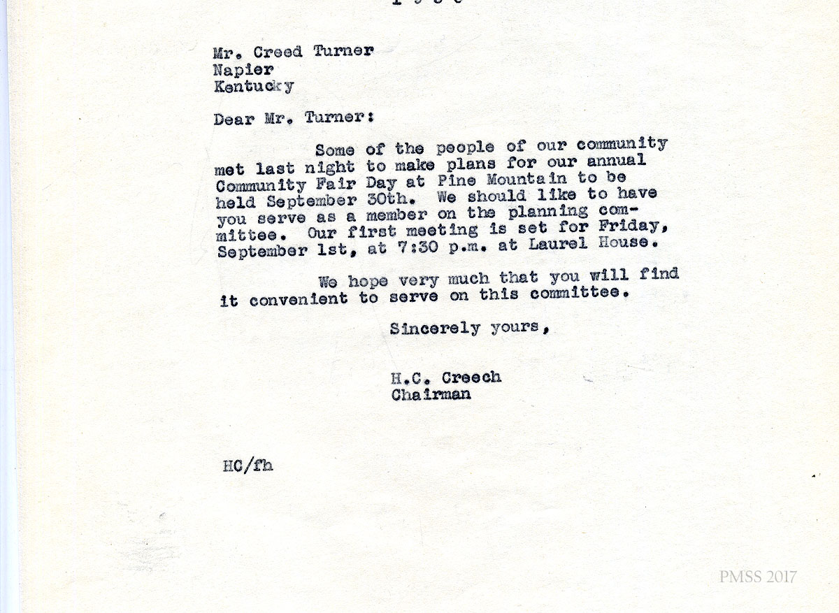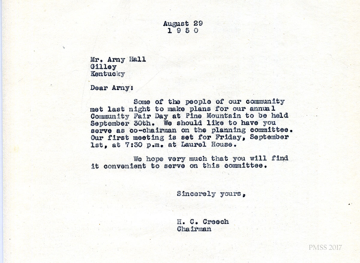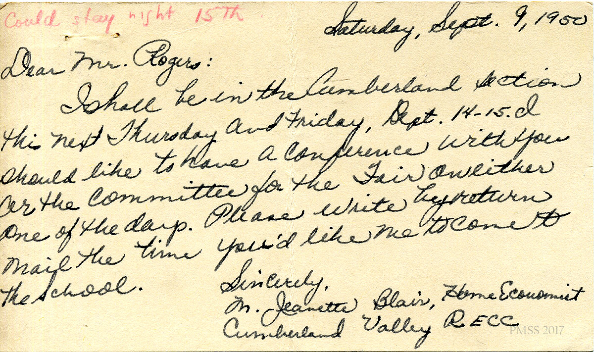 06x September 8, 1950. To Miss M. Jeanette Blair, Home Economist, Cumberland Valley RECC, Corbin, KY, from Fern Hall Hayes, Secretary, Fair Day Committee. Henry C. Creech, Chairman of the Fair Day Committee, has asked Hayes to invite Blair to present a demonstration on Fair Day. She suggests that Blair visit PMSS to “talk over the details.”
