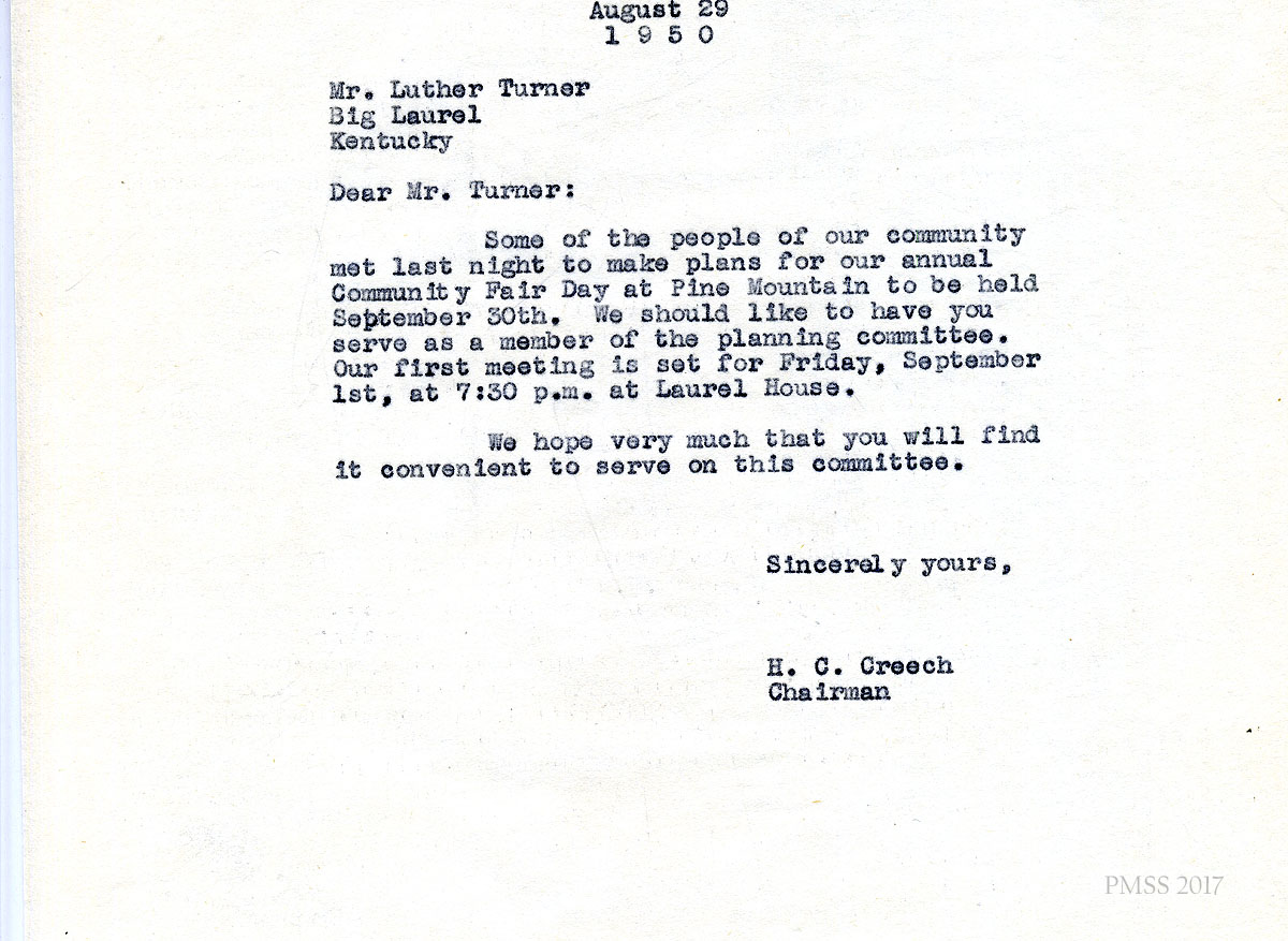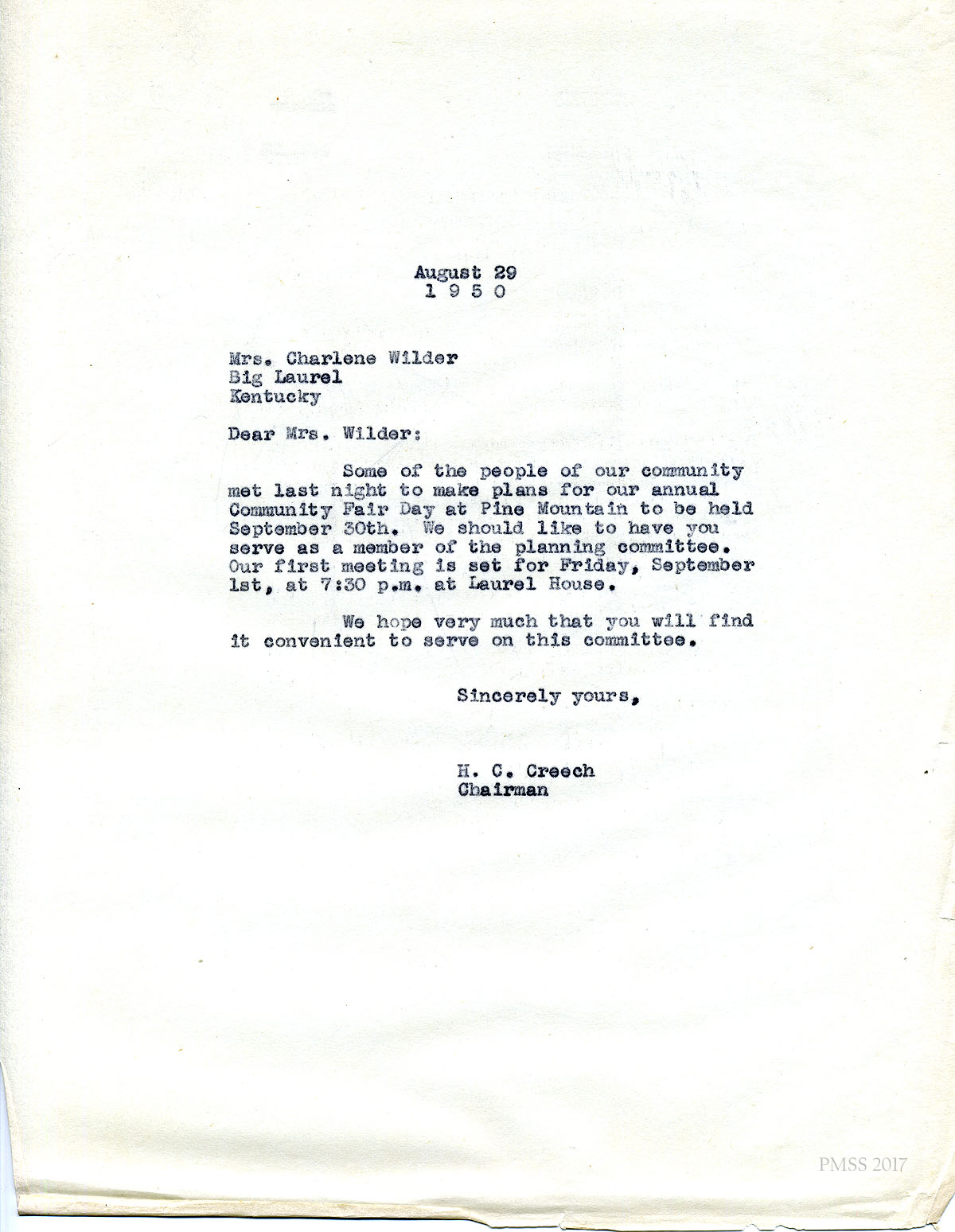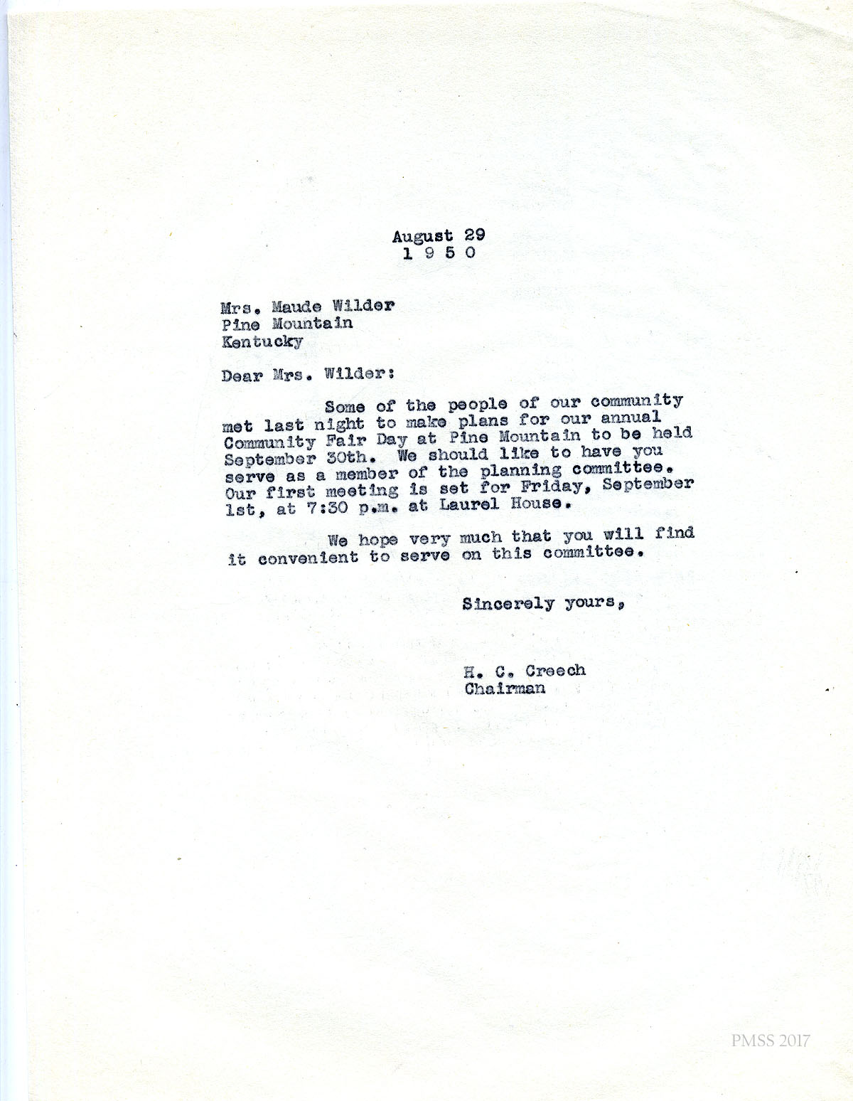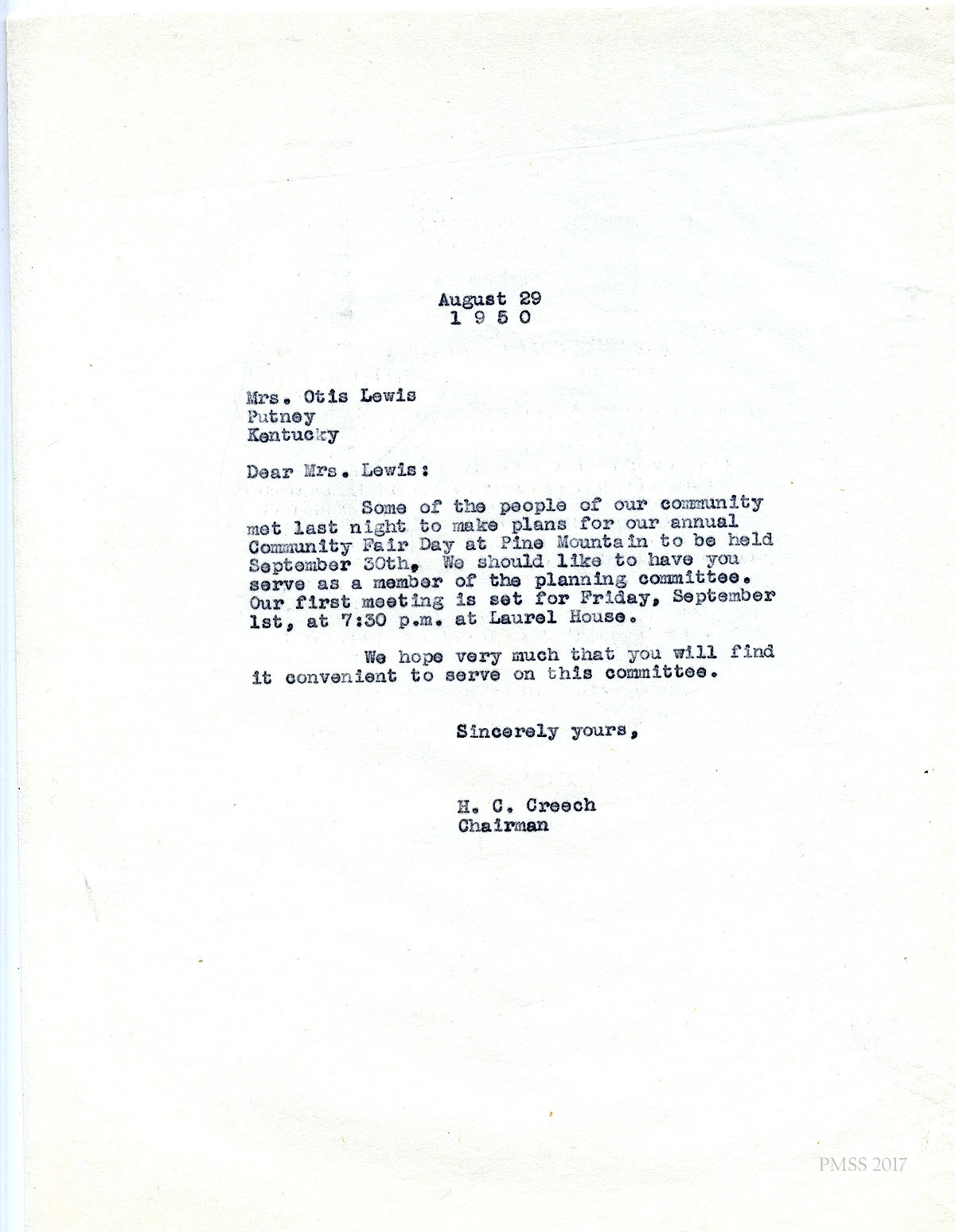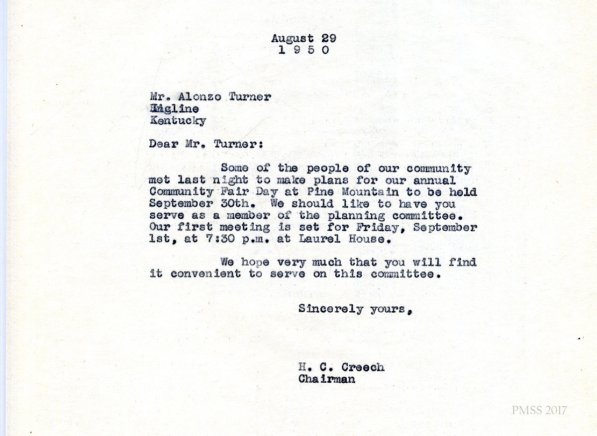 06x September 8, 1950. To Miss M. Jeanette Blair, Home Economist, Cumberland Valley RECC, Corbin, KY, from Fern Hall Hayes, Secretary, Fair Day Committee. Henry C. Creech, Chairman of the Fair Day Committee, has asked Hayes to invite Blair to present a demonstration on Fair Day. She suggests that Blair visit PMSS to “talk over the details.”