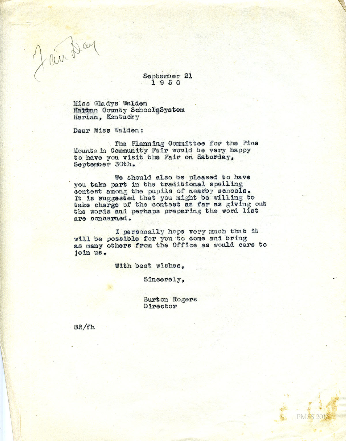 15 September 21, 1950. To Miss Gladys Walden, Harlan County School System, Harlan, KY, from Rogers, inviting her to the Fair and asking her to “take part in the traditional spelling contest among the pupils of nearby schools….giving out the words and perhaps preparing the word list….”