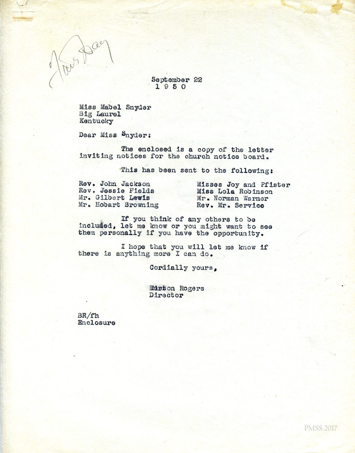 16 September 22, 1950. To Miss Mabel Snyder, Big Laurel, KY from Rogers, enclosing “a copy of the letter inviting notices for the church notice board.” Rogers then lists the names of eight persons to whom he had sent the letter.
