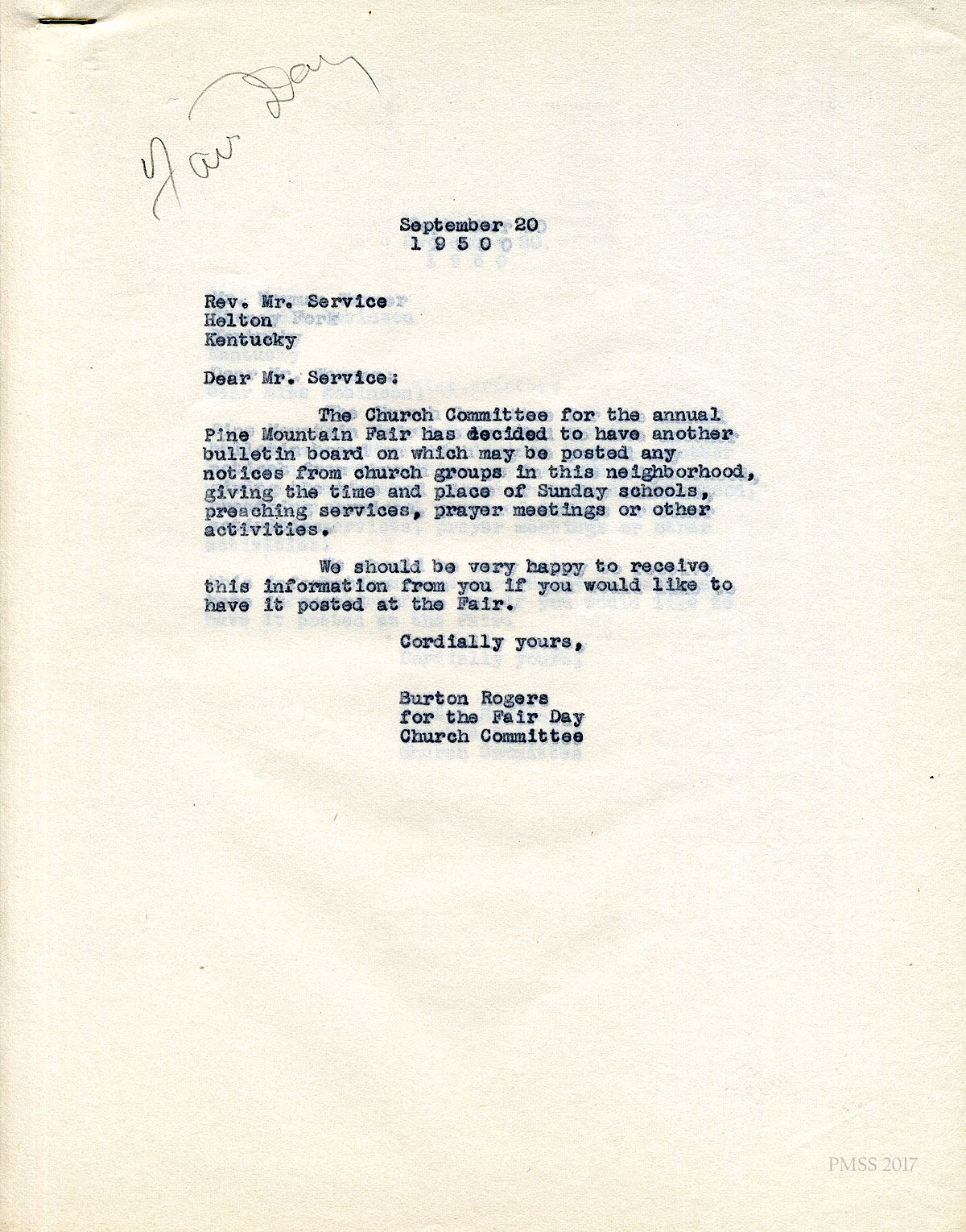 18 September 20, 1950. To Rev. Service, Helton, KY, from “Rogers for the Fair Day Church Committee,” asking for information requesting church activities to post on the bulletin board on Fair Day.