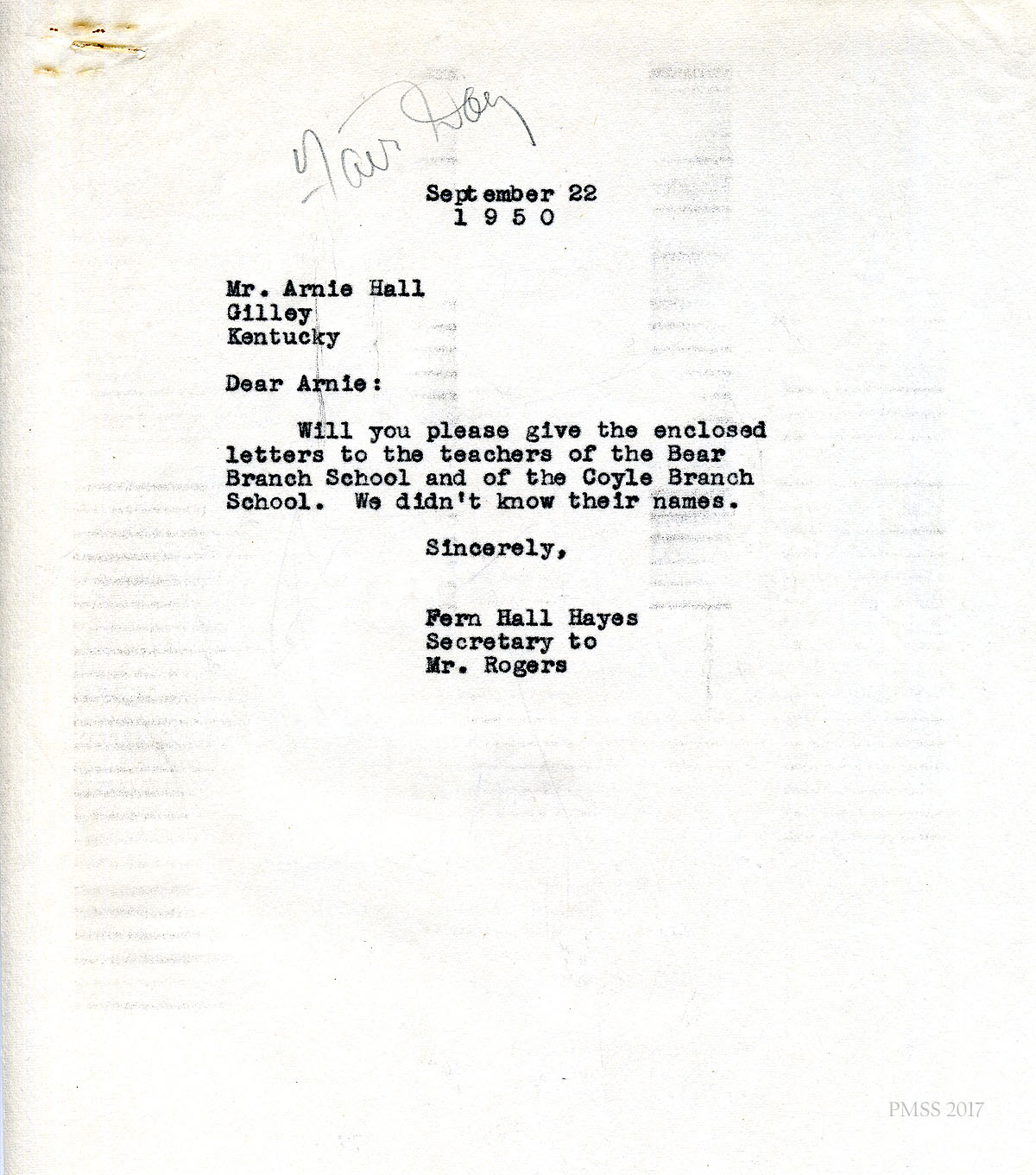 19 September 22, 1950. To Mr. Arnie Hall, Gilley, KY, from Fern Hall Hayes, Rogers’ secretary, asking him to “give the enclosed letters to the teachers of the Bear Branch School and of the Coyle Branch School. We didn’t know their names.”