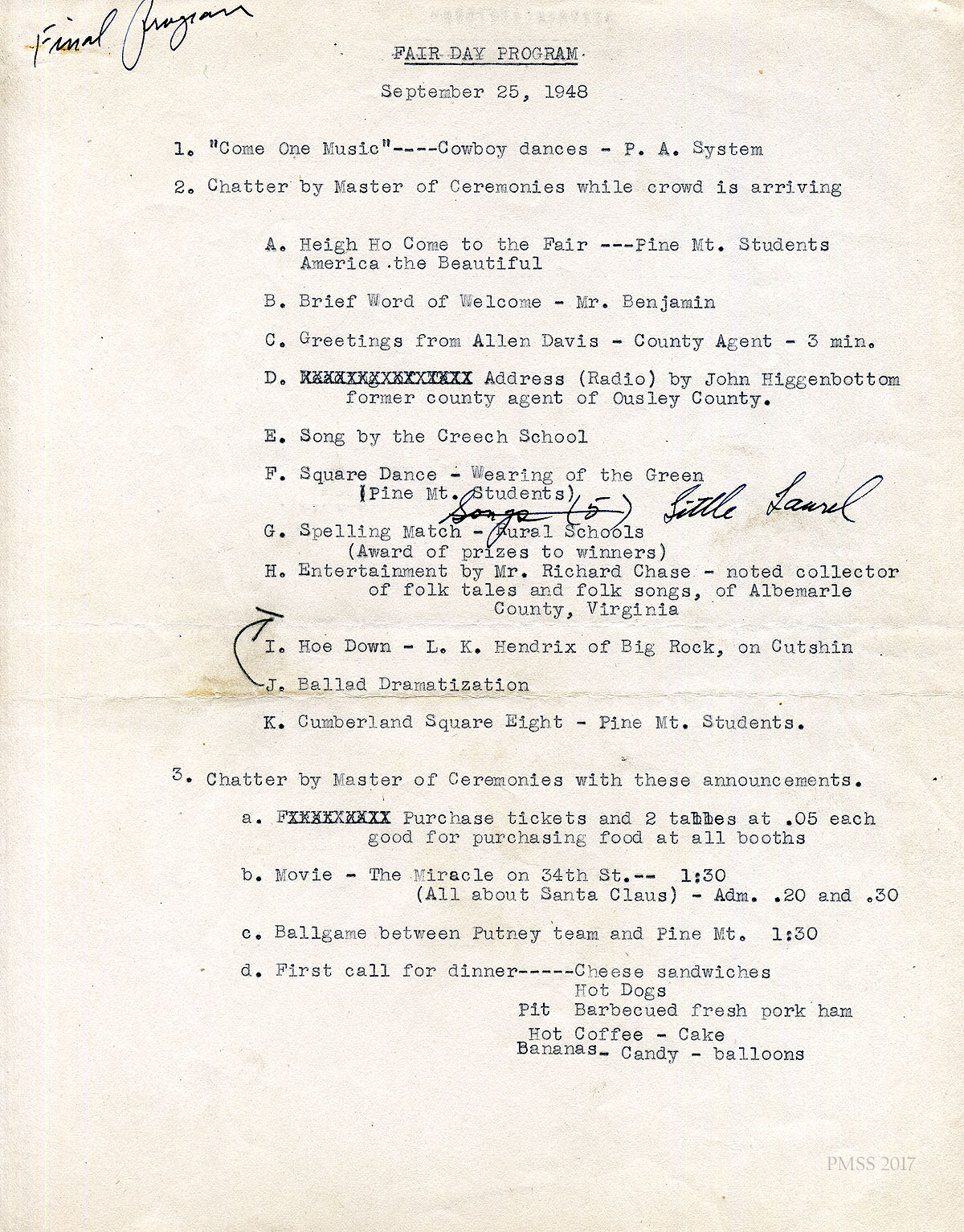22 N.D. Edited announcement that was originally dated September 25, 1948: FAIR DAY PROGRAM [Handwritten notation in margin: “Final Program.”] List of activities, including music on the P.A. system, chatter by Master of Ceremonies, attendee singing, Welcome from Mr. Benjamin, greetings from the county agent, school singing, folk dancing, spelling match, entertainment by Richard Chase, ballad dramatization. Movie: “The Miracle on 34th St.”