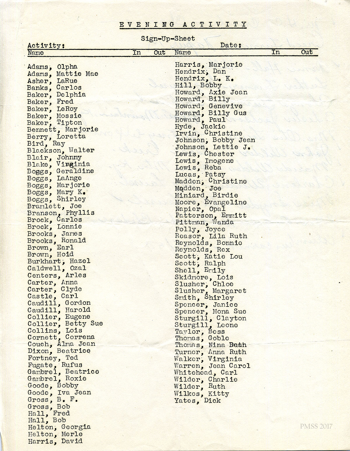 23 N.D. “EVENING ACTIVITY Sign-Up Sheet,” with 2 columns of students’ names and accompanying columns for “In” and “Out.”