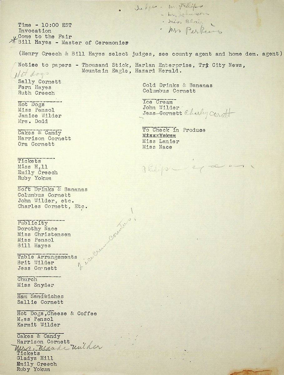 17x N.D. Fair Day plan, listing staff and their responsibilities, including Master of Ceremonies, Bill Hayes. [Handwritten notation in top margin lists the judges.] “Notice to papers – Thousand Stick, Harlan Enterprise, Tri City News, Mountain Eagle, Hazard Herald.”