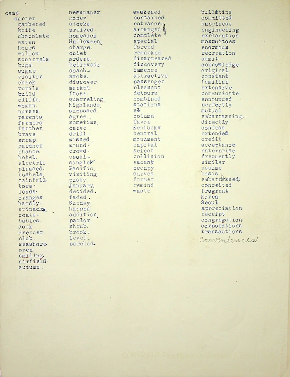 13x N.D. A four-column list of nouns and adjectives, used in a school’s spelling bee at the 1950 Fair Day.