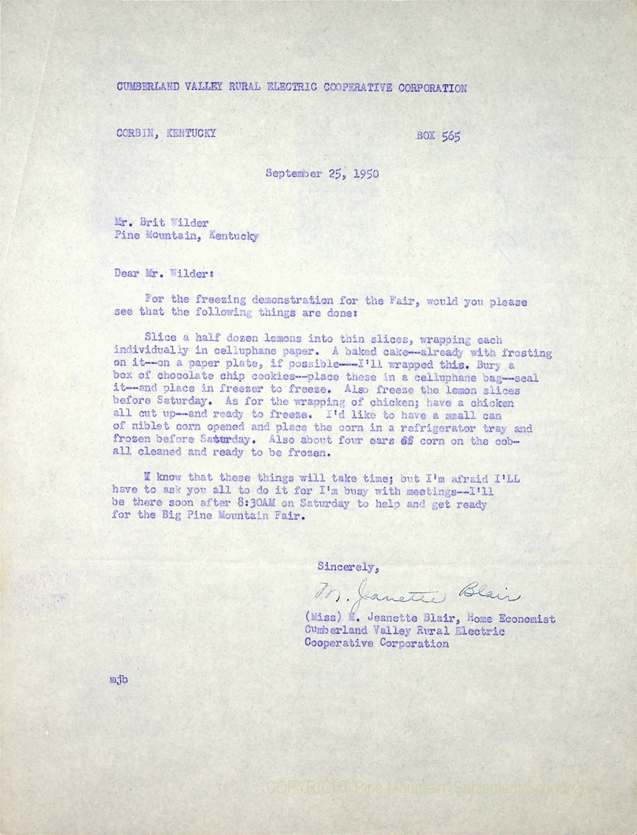 12x September 25, 1950. Carbon copy of a letter to Brit Wilder, Pine Mountain, KY, from M. Jeanette Blair, requesting various items to use in the “freezing” demonstration.
