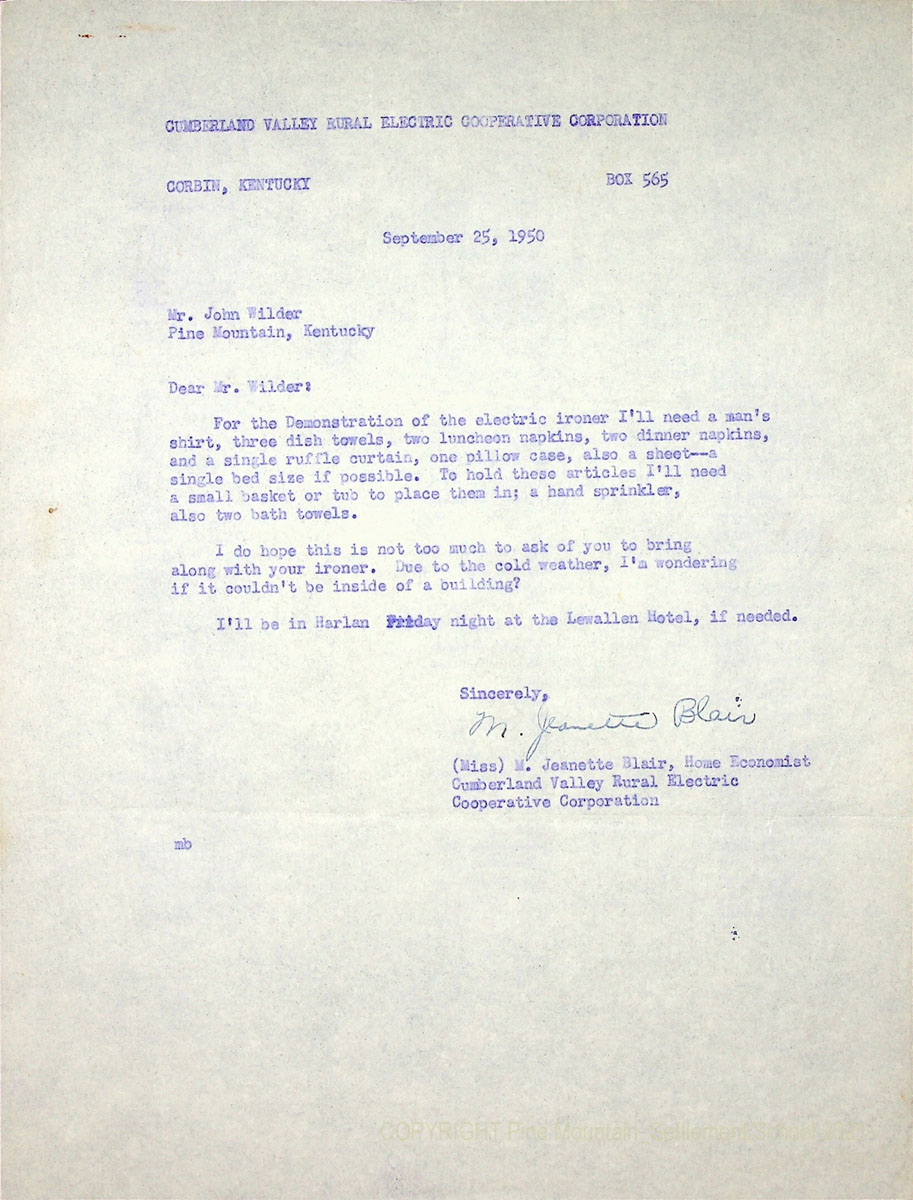 11x September 25, 1950. Carbon copy of a letter to John Wilder, Pine Mountain, KY, from M. Jeanette Blair, requesting various items to use in the demonstration of the electric ironer.