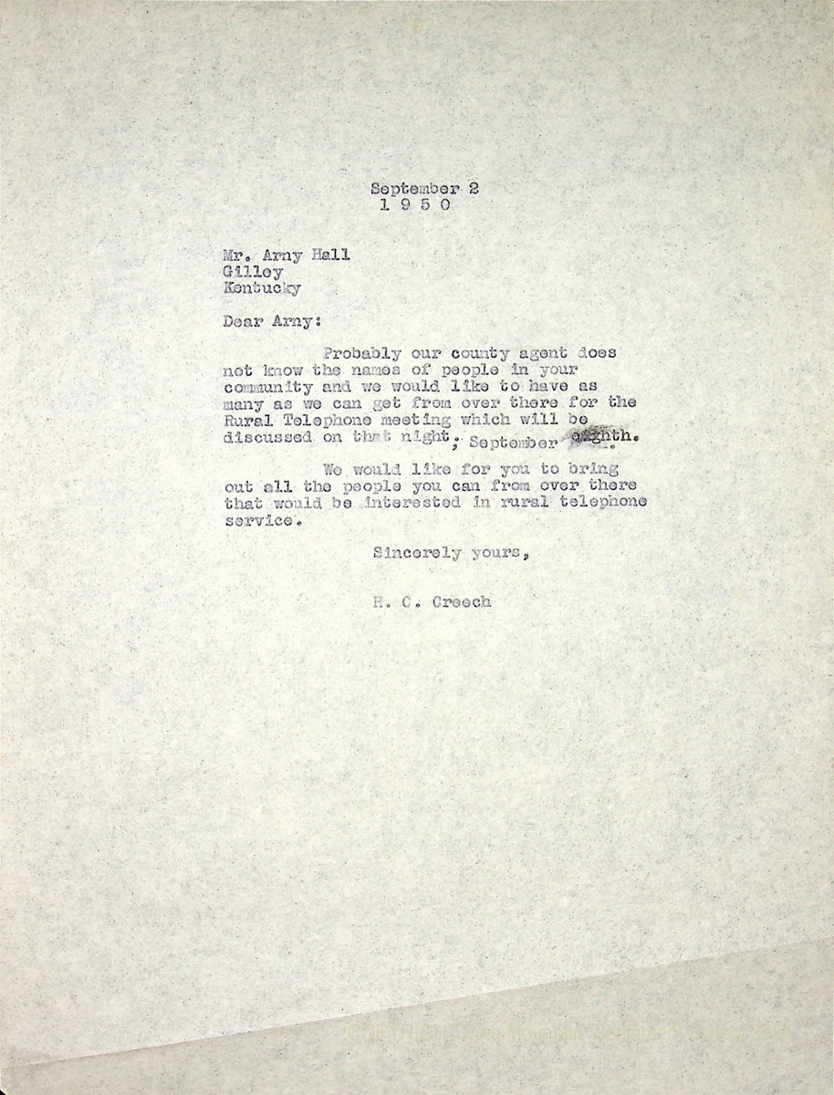 02x September 2, 1950. To Arny Hall, Gilley, KY, from H.C. Creech., asking him to “bring out all the people you can from over there that would be interested in rural telephone service” for a Rural Telephone meeting.