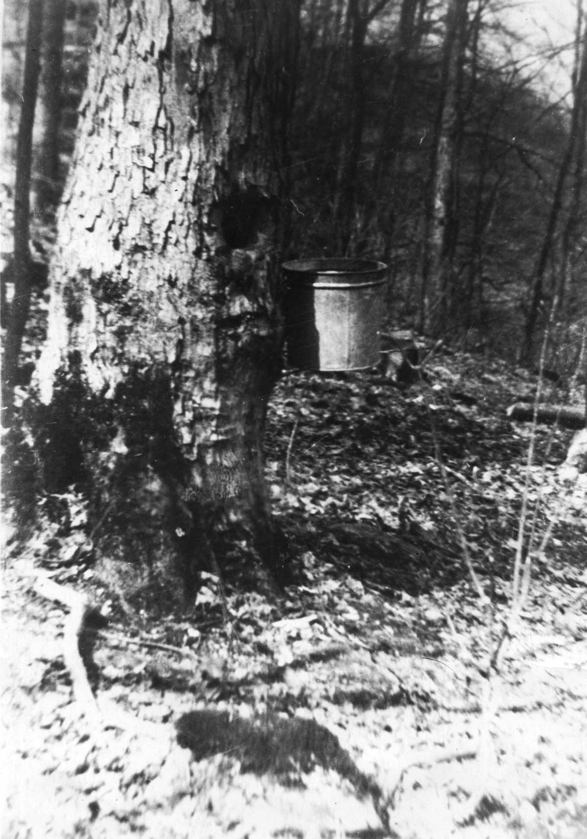 Sugar Maple tree with bucket to catch the sap of tree. Henry Creech’s maple sugar camp. [misc_exhibit_014.jpg]