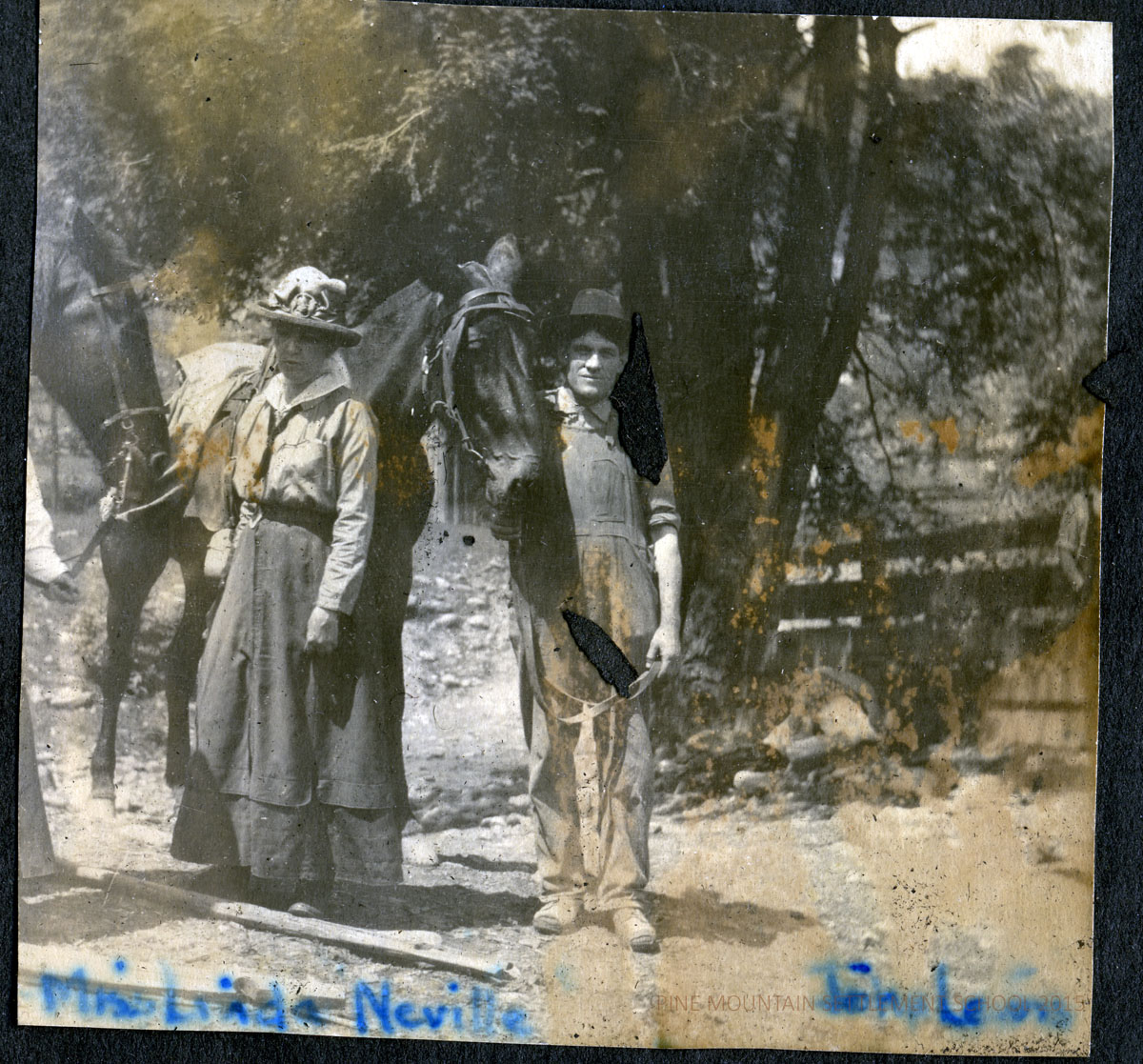 The condition of the photograph album is very poor. Many of the images were damaged by moisture and were adhered to one another or were badly stained or showed substantial emulsion-shift. Luckily, many of the damaged images are reproduced in other collections. Pine Mountain is beginning the process of restoration of many of the images and they are being placed alongside the damaged items in the various Parts I, II, III, etc. The online album will grow as it will now duplicate images in each Part. Please excuse the inconvenience as we shift images and add the new modified images.