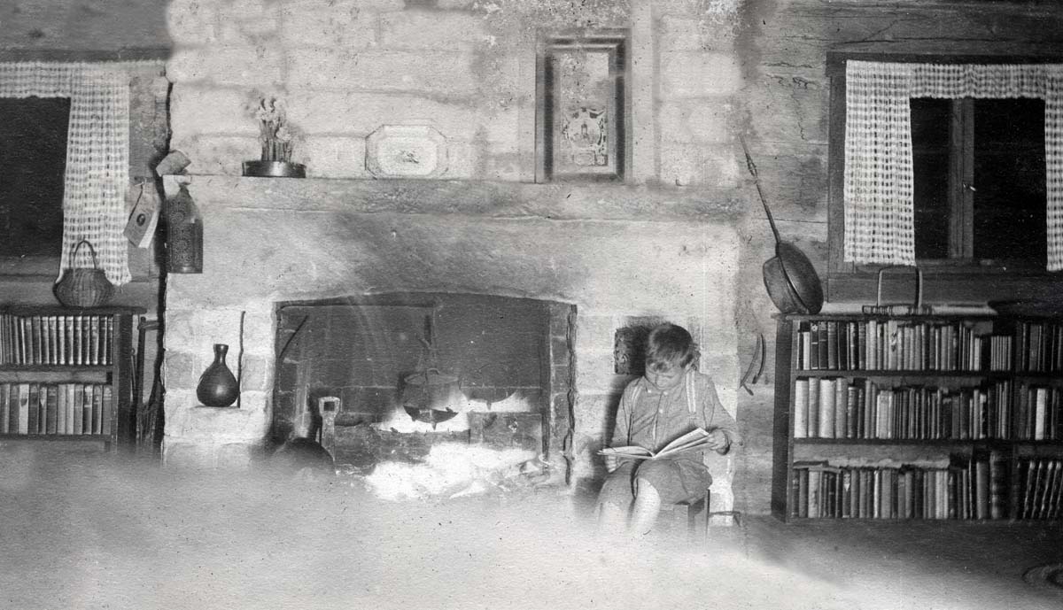 - Restored version. Angela Melville Album II – Part IV. Big Log interior at fireplace. [melv_II_album_166x.jpg]
